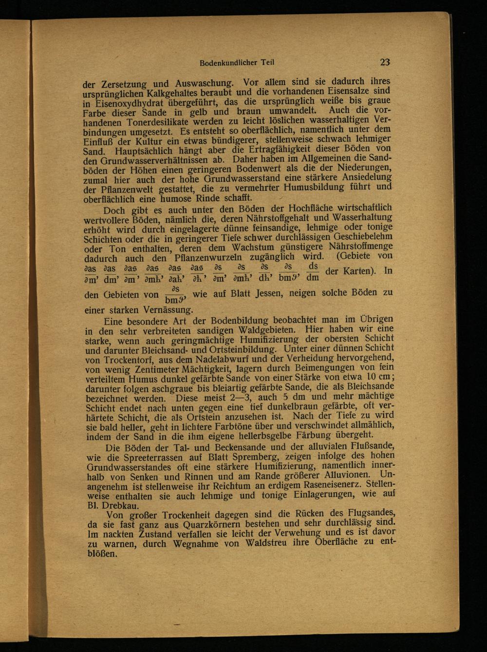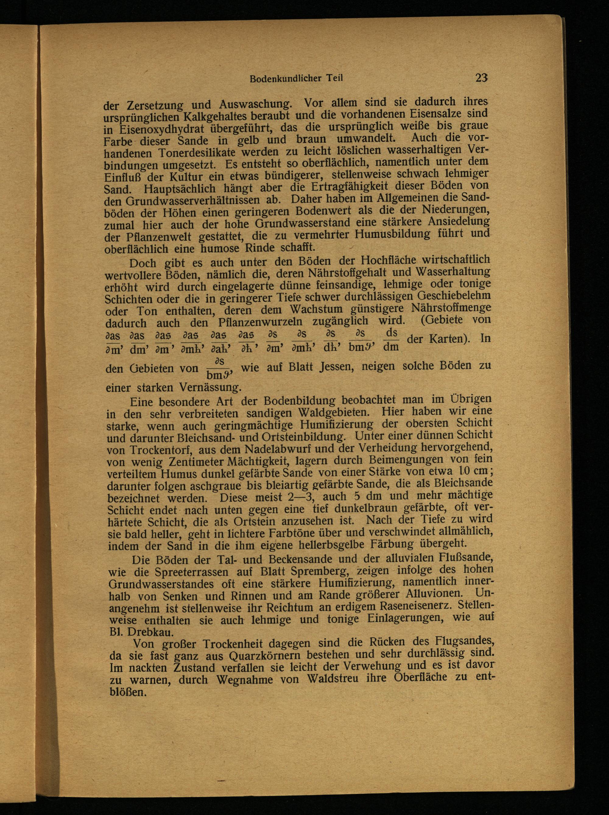 der Zersetzung und Auswaschung. Vor allem sind sie dadurch ihres ursprünglichen Kalkgehaltes beraubt und die vorhandenen Eisensalze sind in Eisenoxydhydrat übergeführt, das die ursprünglich weiße bis graue Farbe dieser Sande in gelb und braun umwandelt. Auch die vorhandenen Tonerdesilikate werden zu leicht löslichen wasserhaltigen Verbindungen umgesetzt. Es entsteht so oberflächlich, namentlich unter dem Einfluß der Kultur ein etwas bündigerer, stellenweise schwach lehmiger Sand. Hauptsächlich hängt aber die Ertragfähigkeit dieser Böden von den Grundwasserverhältnissen ab. Daher haben im Allgemeinen die Sandböden der Höhen einen geringeren Bodenwert als die der Niederungen, zumal hier auch der hohe Grundwasserstand eine stärkere Ansiedelung der Pflanzenwelt gestattet, die zu vermehrter Humusbildung führt und oberflächlich eine humose Rinde schafit.