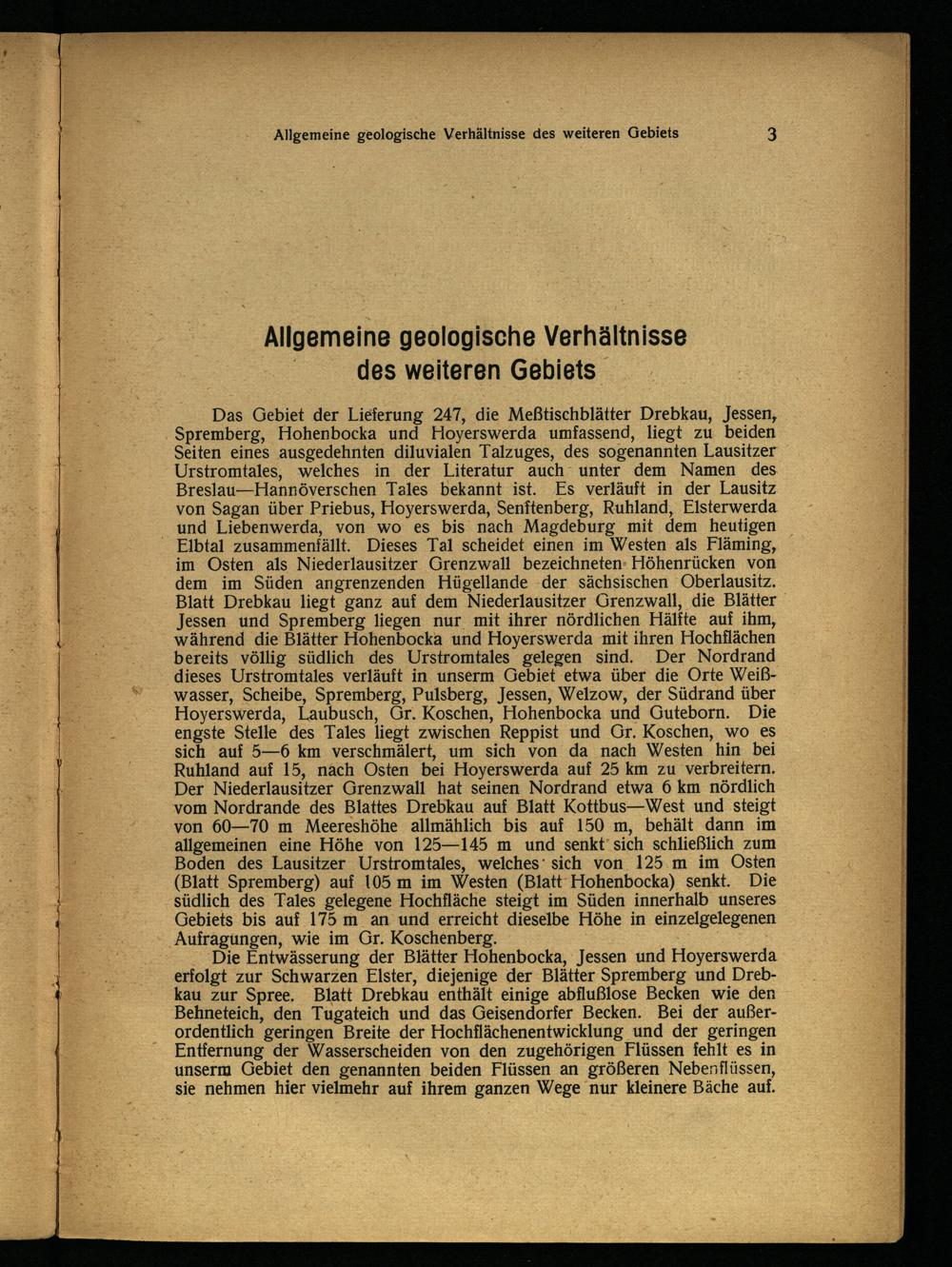 Das Gebiet der Lieferung 247, die Meßtischblätter Drebkau , Jessen, Spremberg , Hohenbocka und Hoyerswerda umfassend, liegt zu beiden Seiten eines ausgedehnten diluvialen Talzuges, des sogenannten Lausitzer Urstromtales , welches in der Literatur auch- unter dem Namen des Breslau —Hannöverschen Tales bekannt ist. Es verläuft in der Lausitz von Sagan über Priebus, Hoyerswerda , Senftenberg , Ruhland, Elsterwerda