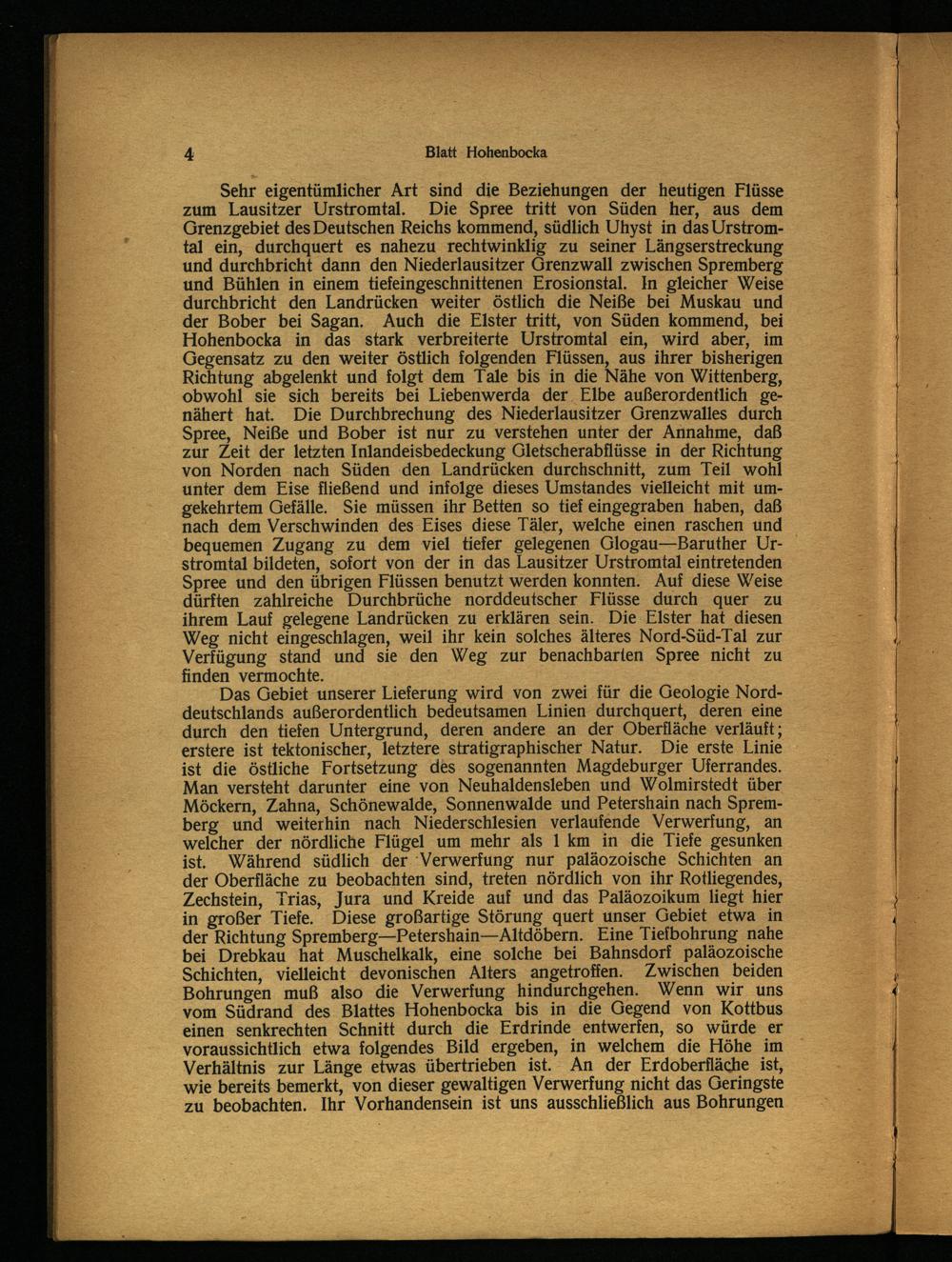Das Gebiet unserer Lieferung wird von zwei für die Geologie Norddeutschlands außerordentlich bedeutsamen Linien durchquert, deren eine durch den tiefen Untergrund, deren andere an der Oberfläche verläuft; erstere ist tektonischer, letztere stratigraphischer Natur. Die erste Linie ist die Östliche Fortsetzung des sogenannten Magdeburger Uferrandes. Man versteht darunter eine von Neuhaldensleben und Wolmirstedt über Möckern , Zahna , Schönewalde, Sonnenwalde und Petershain nach Sprem berg und weiterhin nach Niederschlesien verlaufende Verwerfung, an welcher der nördliche Flügel um mehr als 1 km in die Tiefe gesunken ist. Während südlich der Verwerfung nur paläozoische Schichten an der Oberfläche zu beobachten sind, treten nördlich von ihr Rotliegendes, Zechstein , Trias, Jura und Kreide auf und das Paläozoikum liegt hier in großer Tiefe. Diese großartige Störung quert unser Gebiet etwa in der Richtung Spremberg—Petershain—Altdöbern. Eine Tielbohrung nahe bei Drebkau hat Muschelkalk, eine solche bei Bahnsdorf paläozoische Schichten, vielleicht devonischen Alters angetroffen. Zwischen beiden Bohrungen muß also die Verwerfung hindurchgehen. Wenn wir uns vom Südrand des Blattes Hohenbocka bis in die Gegend von Kottbus einen senkrechten Schnitt durch die Erdrinde entwerfen, so würde er voraussichtlich etwa folgendes Bild ergeben, in welchem die Höhe im Verhältnis zur Länge etwas übertrieben ist. An der Erdoberfläche ist, wie bereits bemerkt, von dieser gewaltigen Verwerfung nicht das Geringste zu beobachten. Ihr Vorhandensein ist uns ausschließlich aus Bohrungen