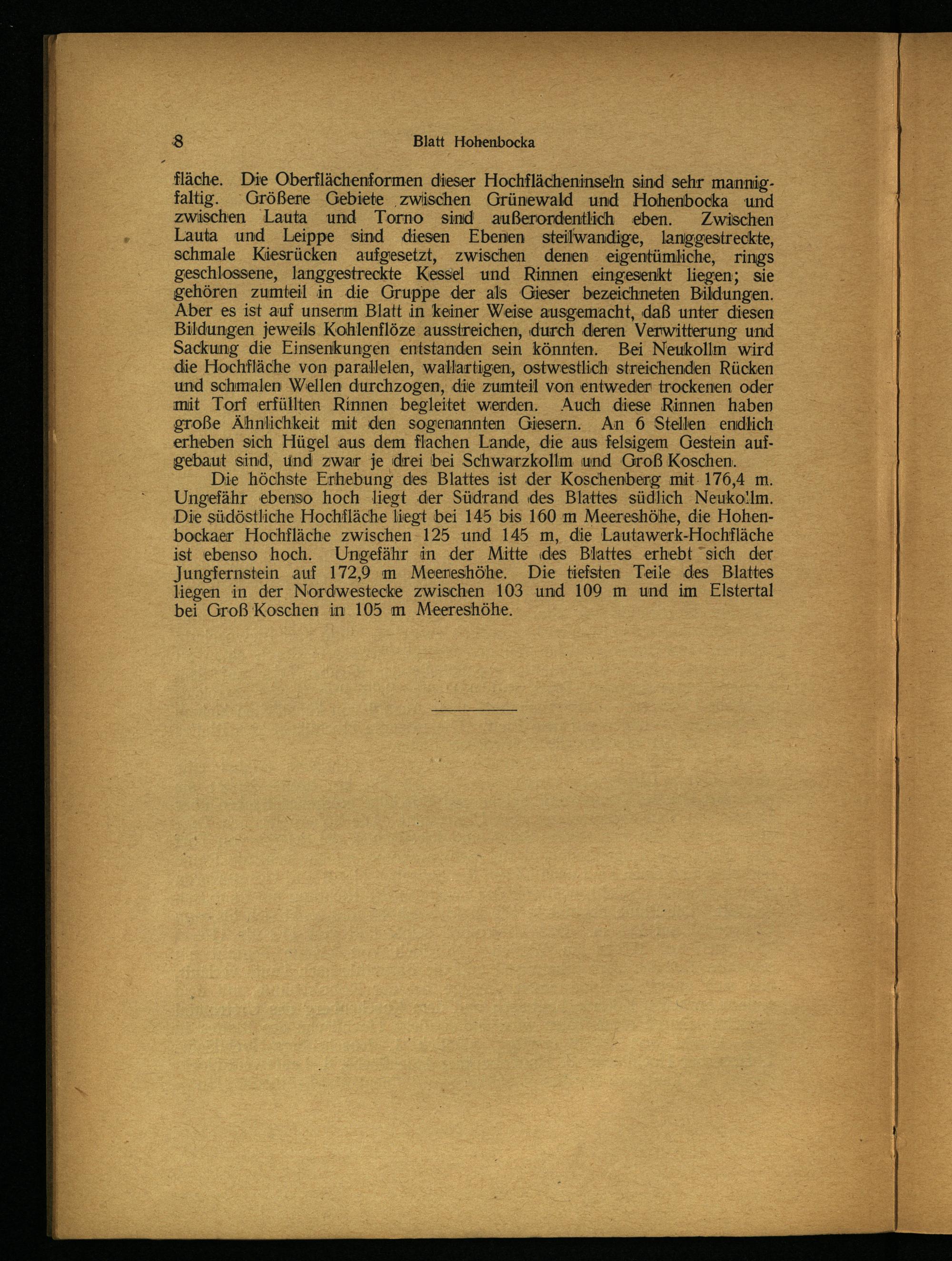 fläche. Die Oberflächenformen dieser Hochflächeninseln sind sehr mannigfaltig. Größere Gebiete zwischen Grünewald und Hohenbocka und zwischen Lauta und Torno sind außerordentlich eben. Zwischen Lauta und Leippe sind diesen Ebenen steilwandige, langgestreckte, schmale Kiesrücken aufgesetzt, zwischen denen eigentümliche, rings geschlossene, langgestreckte Kessel und Rinnen eingesenkt liegen; sie gehören zumteil in die Gruppe der als Gieser bezeichneten Bildungen. Aber es ist auf unserm Blatt in keiner Weise ausgemacht, daß unter diesen Bildungen jeweils Kohlenflöze ausstreichen, durch deren Verwitterung und Sackung die Einsenkungen entstanden sein könnten. Bei Neukollm wird die Hochfläche von parallelen, wallartigen, ostwestlich streichenden Rücken und schmalen Wellen durchzogen, die zumteil von entweder trockenen oder mit Torf erfüllten Rinnen begleitet werden. Auch diese Rinnen haben große Ähnlichkeit mit den sogenannten Giesern. An 6 Stellen endlich erheben sich Hügel aus dem flachen Lande, die aus felsigem Gestein aufgebaut sind, und zwar je drei bei Schwarzkollm und Groß Koschen .