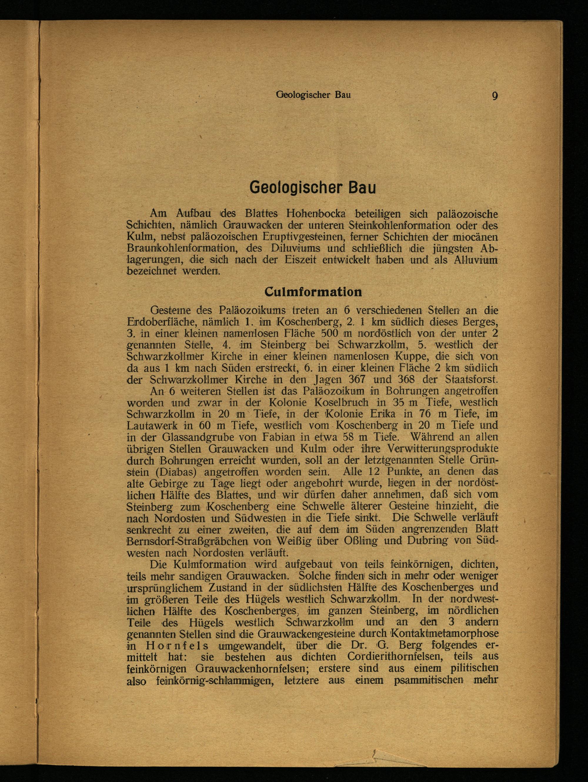 Die Kulmformation wird aufgebaut von teils feinkörnigen, dichten, teils mehr sandigen Grauwacken. Solche finden sich in mehr oder weniger ursprünglichem Zustand in der südlichsten Hälfte des Koschenberges und im größeren Teile des Hügels westlich Schwarzkollm . In der nordwestlichen Hälfte des Koschenberges, im ganzen Steinberg, im nördlichen Teile des Hügels westlich Schwarzkollm und an den 3 andern genannten Stellen sind die Grauwackengesteine durch Kontaktmetamorphose in Hornfels umgewandelt, über ıdie Dr. G. Berg folgendes ermittelt hat: sie bestehen aus dichten Cordierithornfelsen, teils aus feinkörnigen Grauwackenhornfelsen; erstere sind aus einem Ppilitischen also feinkörnig-schlammigen, letztere aus einem psammitischen mehr