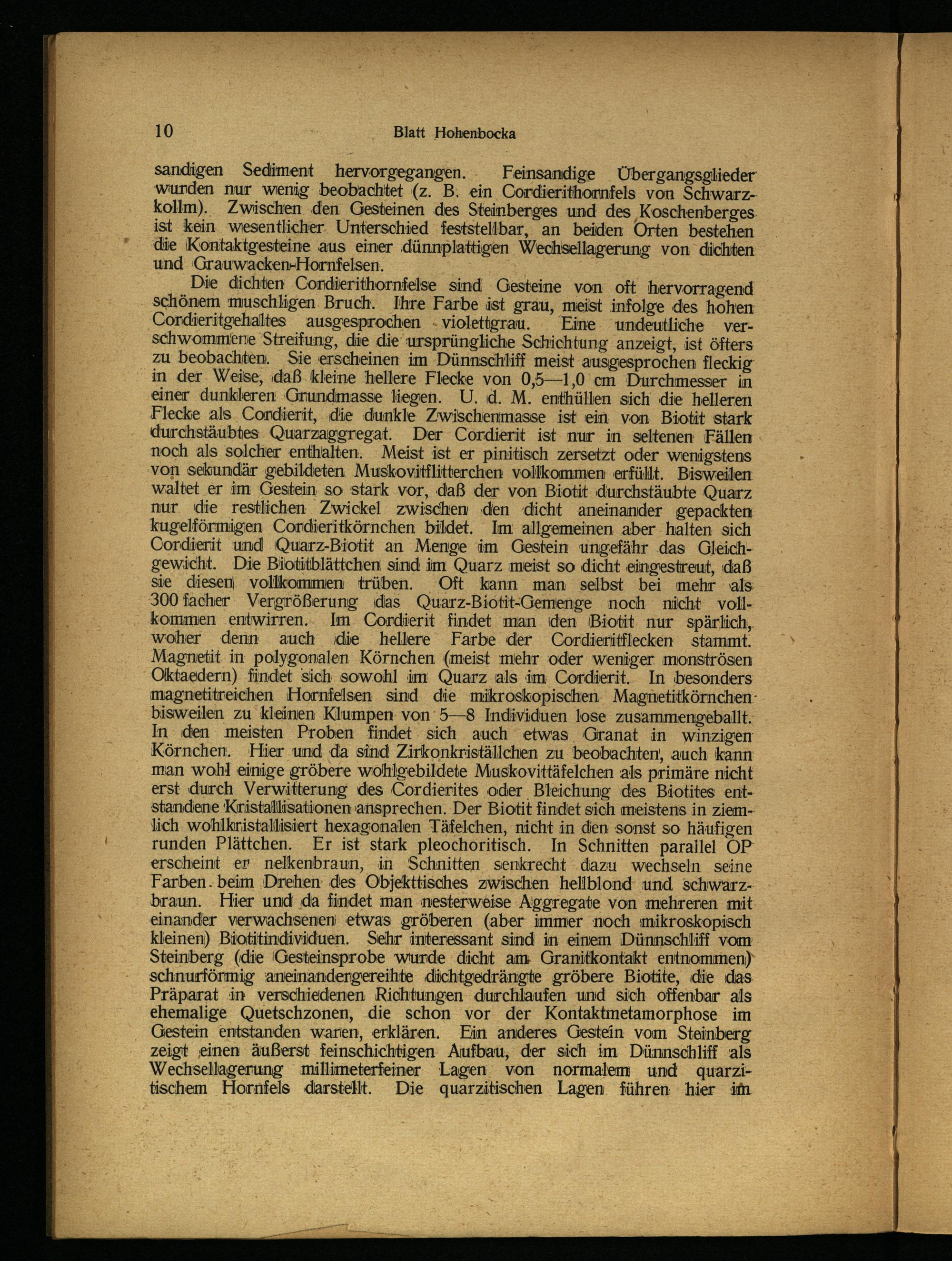 sandigen Sediment hervorgegangen.. Feinsandige Über gangsglieder wurden nur wenig beobachtet(z. B. ein Cordierithornfels von Schwarz kollm ). Zwischen ‚den Gesteinen des Steinberges und des Koschenberges. ist kein. wesentlicher. Unterschied feststellbar, an beiden Orten bestehen die Kontaktgesteine aus einer dünnplattigen Wechsellagerung von dichten: und Grauwacken-Hornfelsen.;