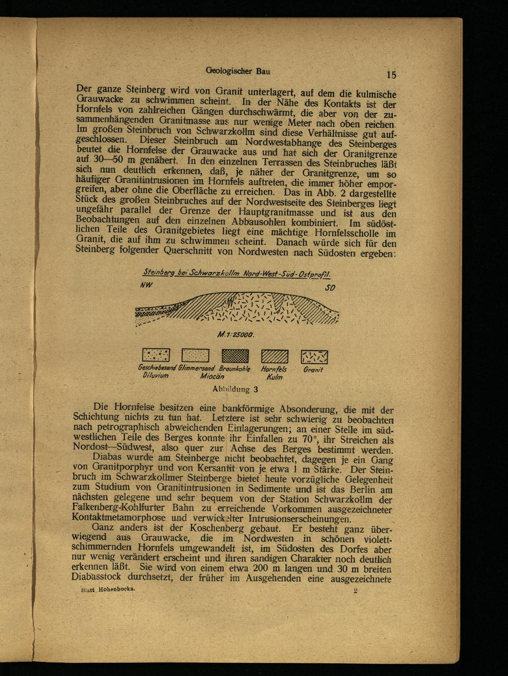 Der ganze Steinberg wird von Granit unterlagert, auf dem die kulmische Grauwacke zu schwimmen scheint. In der Nähe des‘ Kontakts ist‘der Hornfels von zahlreichen Gängen durchschwärmt, die aber von der ZU
