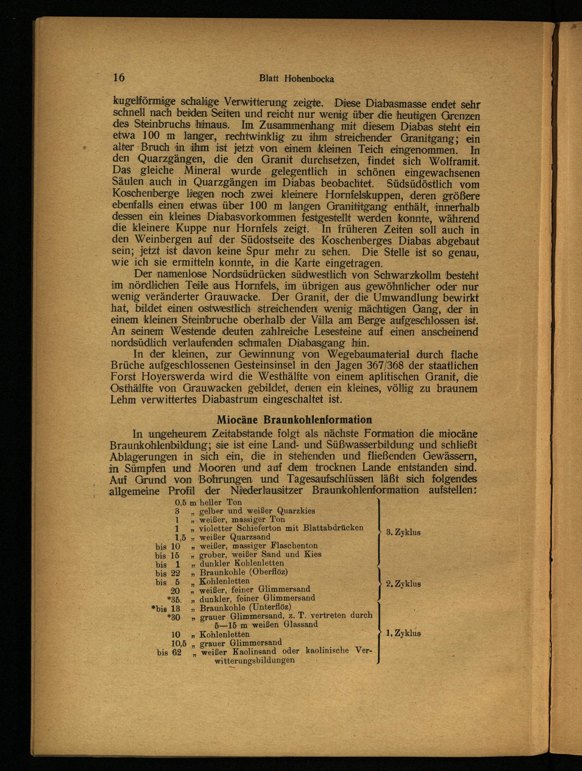 Miocäne Braunkohlenformation In ungeheurem Zeitabstande folgt als nächste Formation die miocäne Braunkohlenbildung; sie ist eine Land- und Süßwasserbildung und schließt Ablagerungen in sich ein, die in stehenden und fließenden Gewässern, in Sümpfen und Mooren und auf dem trocknen Lande entstanden sind. Auf. Grund von Bohrungen und Tagesaufschlüssen läßt sich folgendes allgemeine Profil der Niederlausitzer Braunkohlenformation aufstellen: 0,5 m’heller Ton 3„ gelber und weißer Quarzkies 1„ weißer, massiger Ton 1 violetter Schieferton mit Blattabdrücken 7; 3. Zyklus 1,5„ weißer Quarzsand bis 10» weißer, massiger Flaschenton bis 15» grober, weißer Sand und Kies bis 1» dunkler Kohlenletten bis 22„ Braunkohle(Oberflöz). bis 5„ Kohlenletten 9. Zyklus 20» weißer, feiner Glimmersand *35,„ dunkler, feiner Glimmersand *bis 13» Braunkohle(Unterflöz) *80.» grauer Glimmersand, z. T. vertreten durch 5—15 m weißen Glassand. 10» Kohlenletten 4 1, Zyklus 10,5 rauer Glimmersan bis 62 ler Kaolinsand oder kaolinische Verwitterungsbildungen