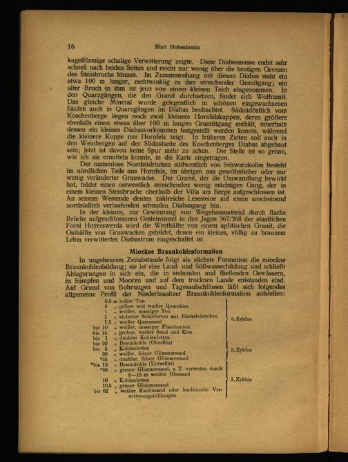 ‚In der kleinen, zur Gewinnung von Wegebaumaterial durch flache Brüche aufgeschlossenen Gesteinsinsel in den Jagen 367/368 der staatlichen Forst Hoyerswerda wird die Westhälfite von einem aplitischen Granit, die Osthälfte von Grauwacken gebildet, denen ein kleines, völlig zu braunem Lehm verwittertes Diabastrum eingeschaltet ist.