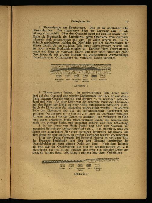 4. In der Grube‘ Germania bei Bahnhof Hosena im südlichen Teile der Hosenaer Hochfläche liegt über dem Glassand unmittelbar ‚der Geschiebelehm mit ‚einer dünnen Decke von Sand. Nach dem Talrande hin keilt sich der Geschiebelehm aus und ein Braunkohlenflöz von 2 m Mächtigkeit legt sich an, auf welchem eine etwa 3 m mächtige Decke von kiesigem Talsand liegt. Abbildung 5 gibt ein Bild dieser Verhältnisse.}