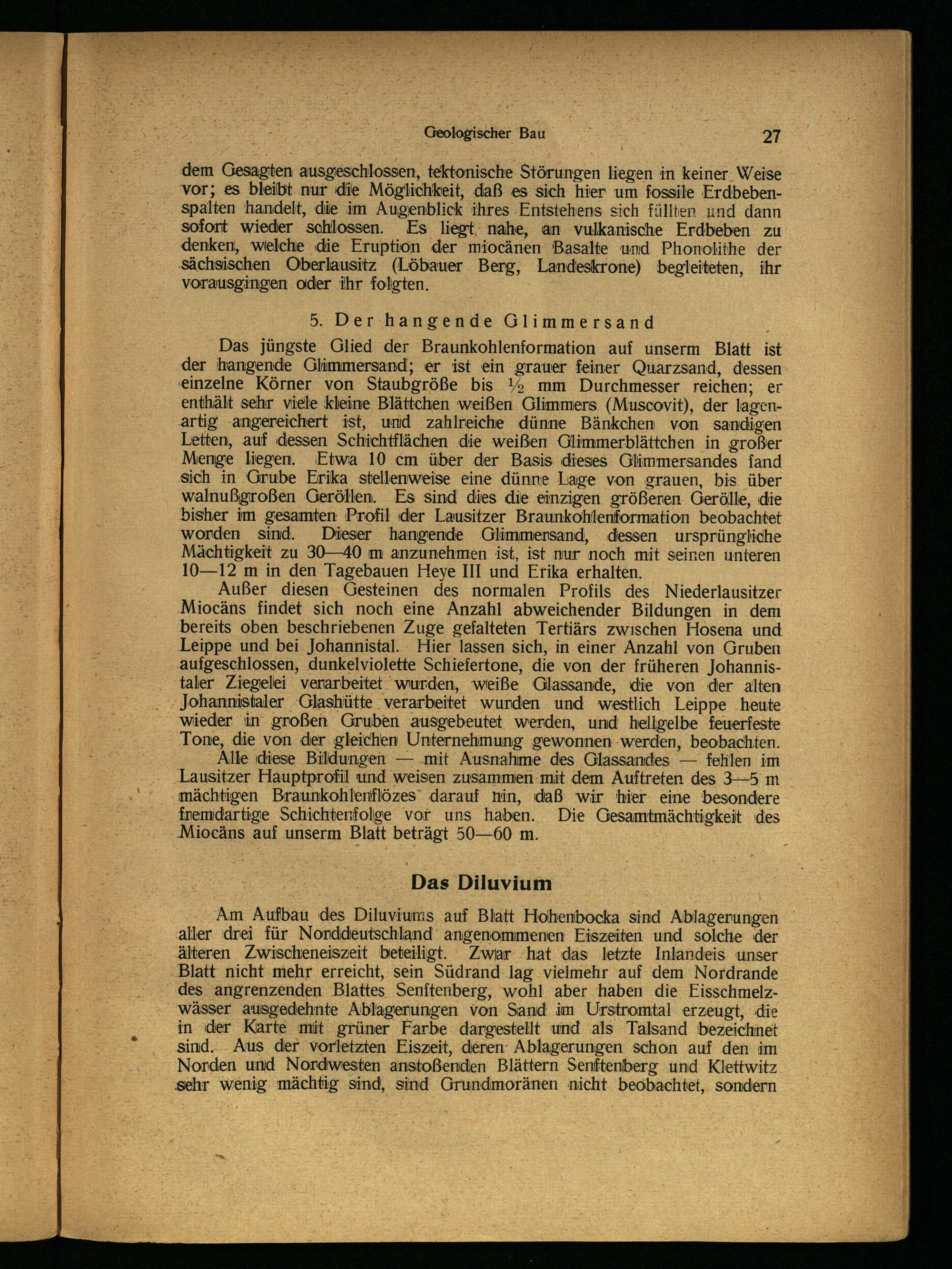 Am Aufbau des Diluviums auf Blatt Hohenbocka sind Ablagerungen aller drei für Norddeutschland‘ angenommenen Eiszeiten und solche der ‚älteren Zwischeneiszeit beteiligt. Zwar hat das letzte Inlandeis unser Blatt nicht mehr erreicht, sein Südrand lag vielmehr auf dem Nordrande des angrenzenden Blattes Senftenberg , wohl aber haben die Eisschmelzwässer ausgedehnte Ablagerungen von Sand im Urstromtal erzeugt, die in der Karte mit grüner Farbe dargestellt und als Talsand bezeichnet sind... Aus der vorletzten Eiszeit, deren‘ Ablagerungen schon auf den im Norden und Nordwesten anstoßenden Blättern Senftenberg und Klettwitz sehr wenig mächtig sind, sind Grundmoränen nicht beobachtet, sondern