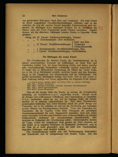 Blattes unter der Forst Hohenbocka große Flächen einnehmen. Danach können wir die diluvialen Bildungen unseres Blattes in folgender Weise gliedern:;; Ablag. der Ill. Eiszeit: Niederungsbildungen, Talsand. II. Zwischeneiszeit: nicht beobachtet. Sand und Kies „ IM. Eiszeit: Hochflächenbildungen© Tonmergel . Endmoränenwälle. I. Zwischeneiszeit: Hochflächenbildungen, Kies. I. Eiszeit: Hochflächenbildungen, Geschiebelehm.