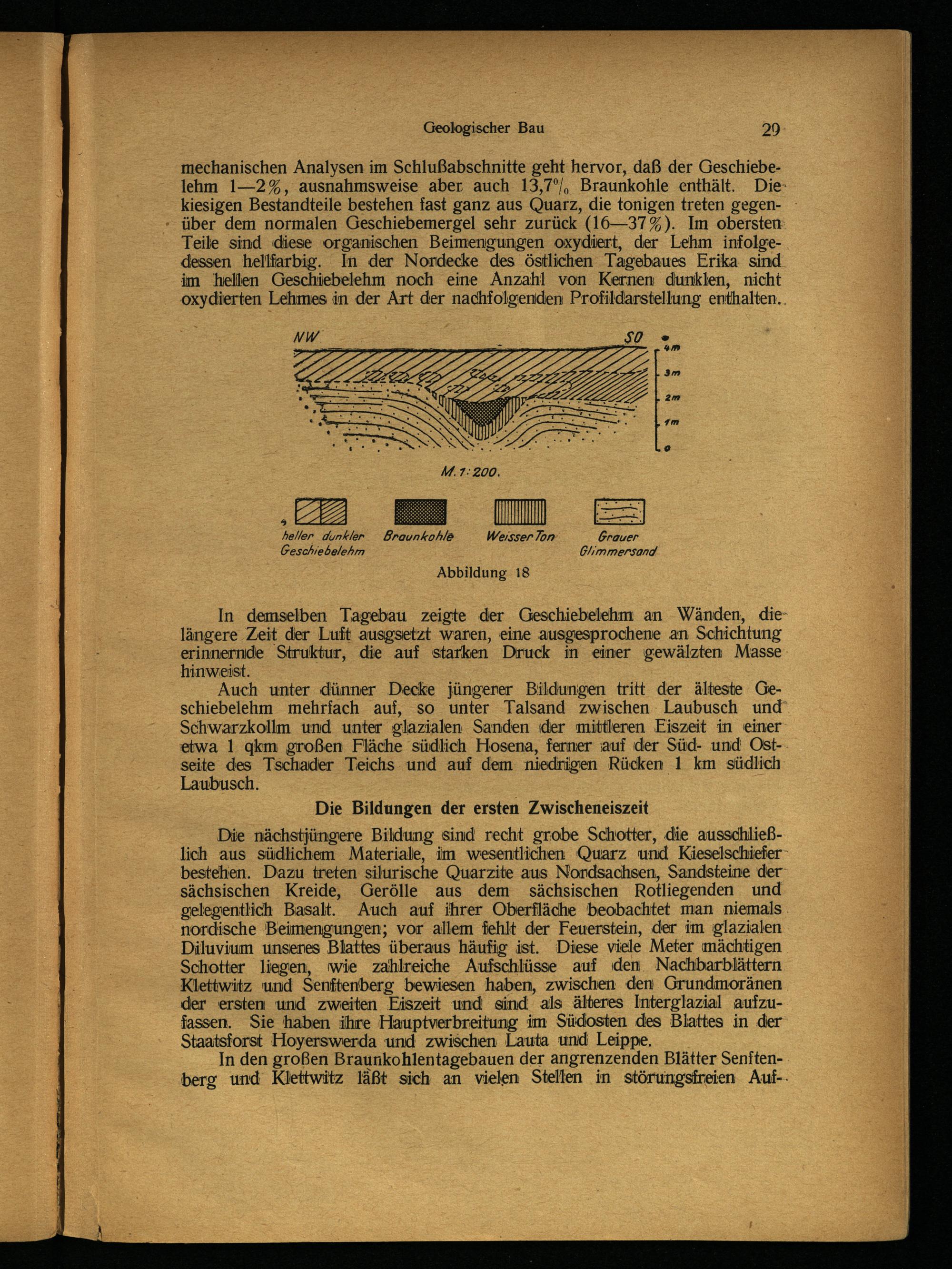 In demselben Tagebau zeigte der Geschiebelehm an Wänden, dielängere Zeit der Luft ausgsetzt waren, eine ausgesprochene an Schichtung erinnernde Struktur, die auf starken Druck in einer gewälzten Masse: hinweist.;