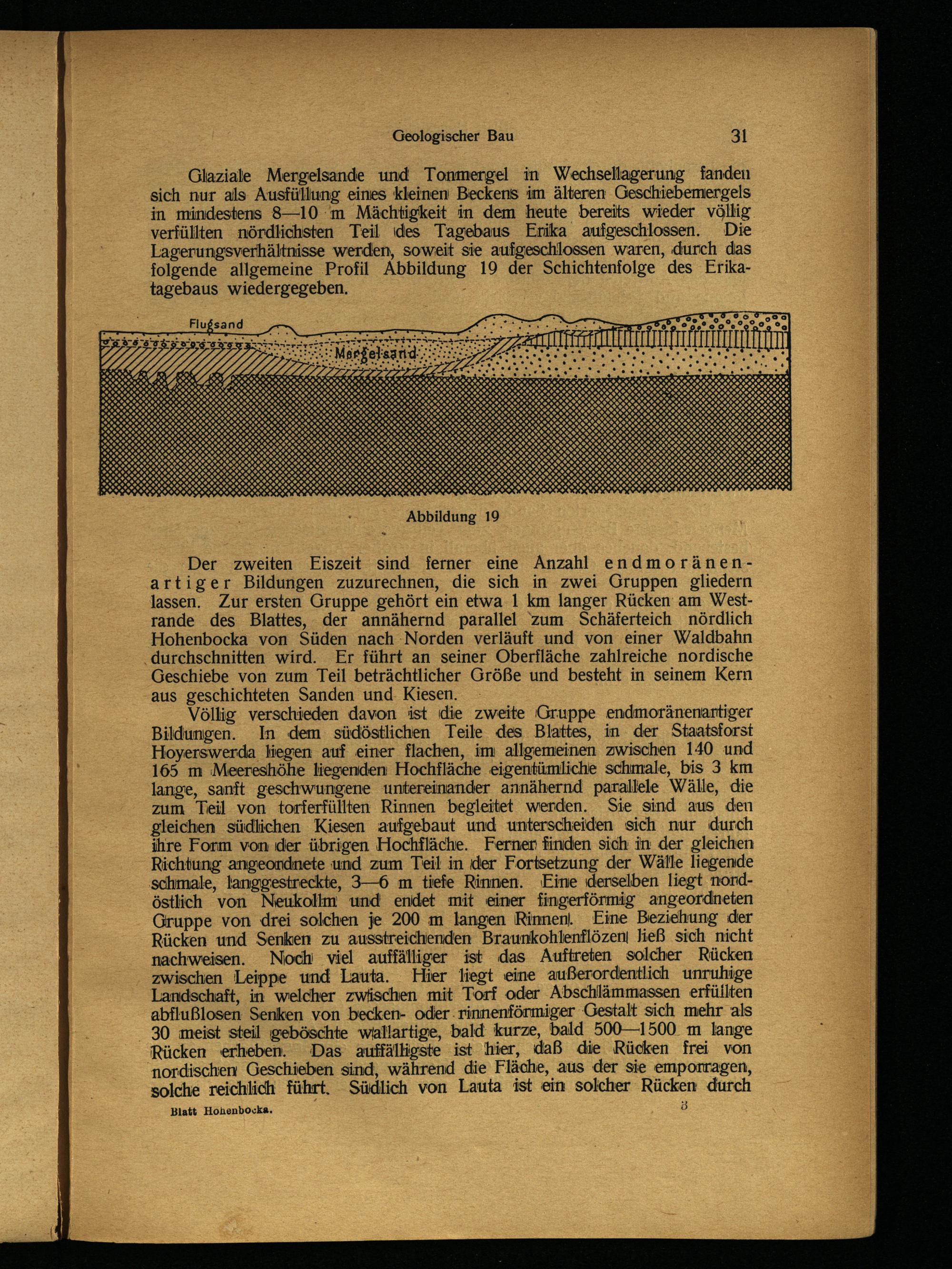 Der zweiten Eiszeit sind ferner eine Anzahl endmoränenartiger Bildungen zuzurechnen, die sich in zwei Gruppen gliedern lassen. Zur ersten Gruppe gehört ein etwa 1 km langer Rücken am Westrande des Blattes, der annähernd parallel zum Schäferteich nördlich Hohenbocka von Süden nach Norden verläuft und von einer Waldbahn ‚durchschnitten wird. Er führt an seiner Oberfläche zahlreiche nordische Geschiebe von zum Teil beträchtlicher Größe und besteht in seinem Kern aus geschichteten Sanden und. Kiesen.