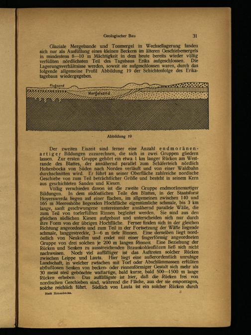 Glaziale Mergelsande und Tonmerngel in Wechsellagerung fanden sich nur als. Ausfüllung eines kleinen Beckens im älteren Geschiebemergels in mindestens 8—10 m Mächtigkeit in dem heute bereits wieder völlig. verfüllten nördlichsten Teil des Tagebaus Erika aufgeschlossen. Die Lagerungsverhältnisse werden, soweit sie aufgeschlossen waren, durch das folgende allgemeine Profil Abbildung 19 der Schichtenfolge des Erikatagebaus wiedergegeben.