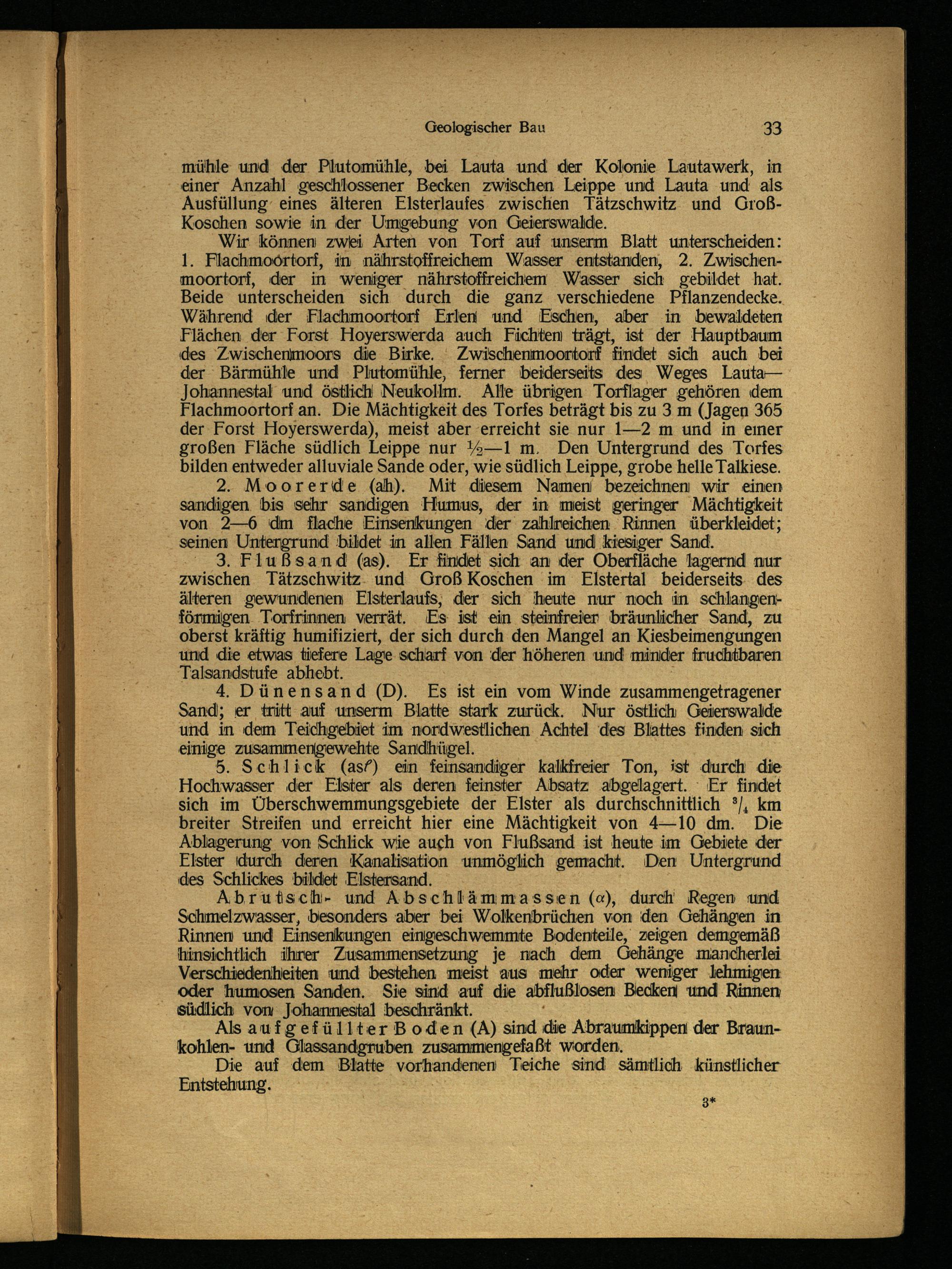 ‘3. F1lußsand(as). Er findet sich an der Oberfläche lagernd nur zwischen Tätzschwitz . und Groß Koschen im Elstertal beiderseits. des älteren gewundenen Elsterlaufs; der‘ sich heute nur noch in schlangenförmigen. Torfrinnen verrät. Es ist ein steinfreier bräunlicher Sand, zu oberst kräftig humifiziert, der sich durch den Mangel an Kiesbeimengungen und die etwas tiefere Lage: scharf von der höheren und minder fruchtbaren. Talsandstufe abhebt.