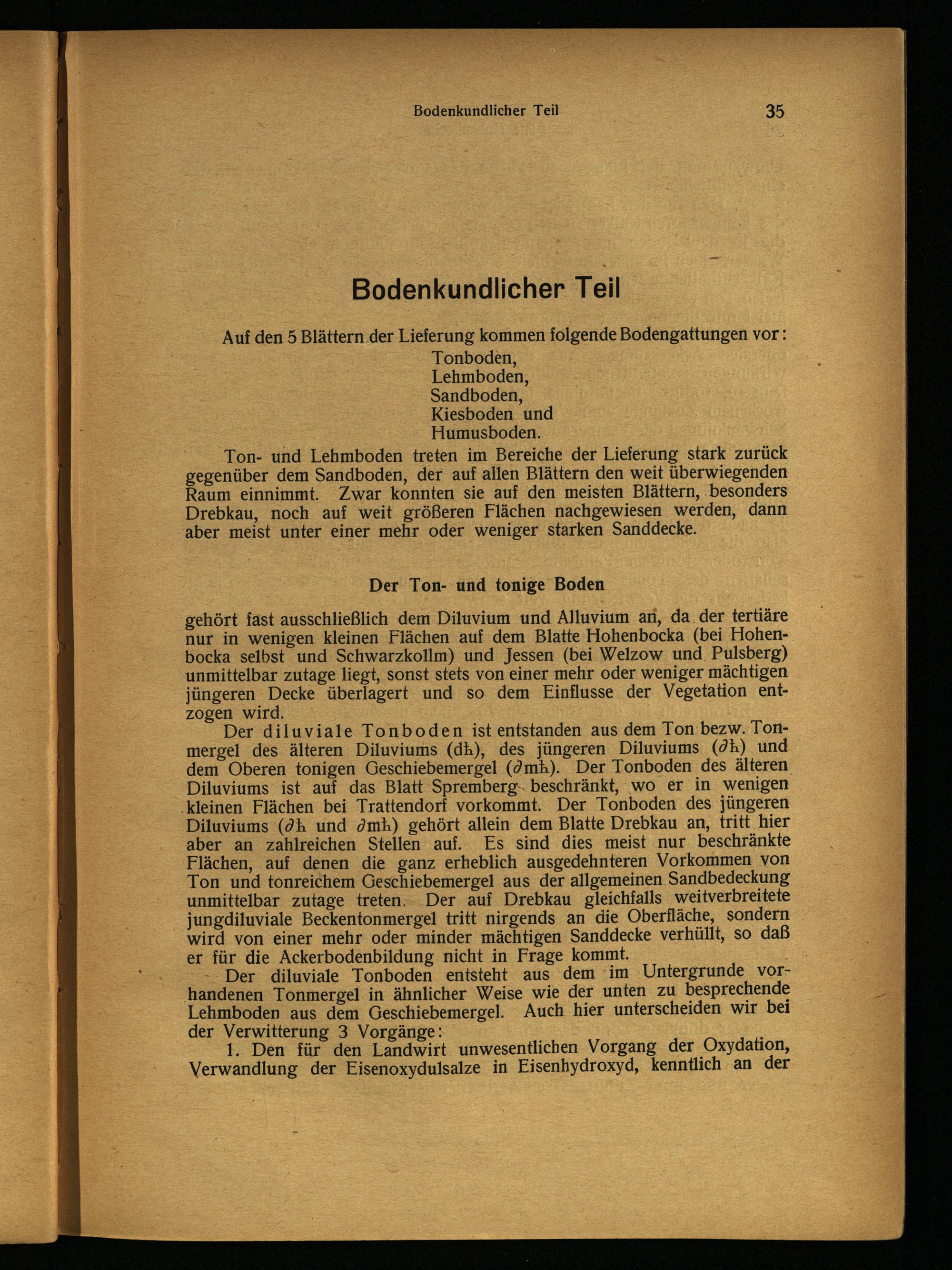 - Der diluviale Tonboden entsteht aus dem im Untergrunde vorhandenen Tonmergel in ähnlicher Weise wie der unten zu besprechende Lehmboden aus dem Geschiebemergel. Auch hier unterscheiden wir bei der Verwitterung 3 Vorgänge: