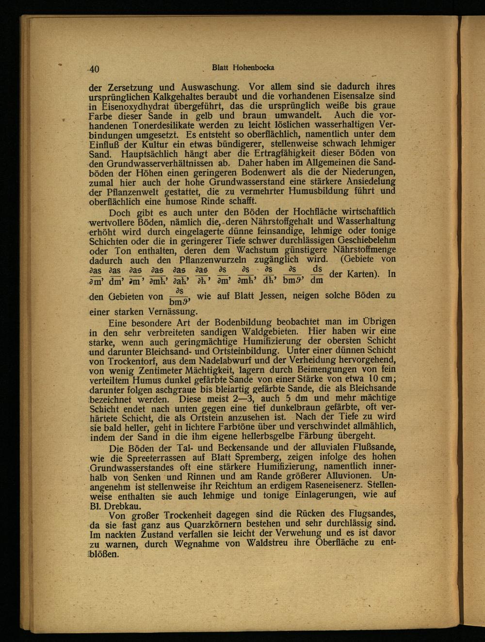 Die Böden der Tal- und Beckensande und der alluvialen Flußsande, wie die Spreeterrassen auf Blatt Spremberg , zeigen infolge des hohen Grundwasserstandes oft eine stärkere Humifizierung, namentlich innerhalb von Senken und Rinnen und am Rande größerer Alluvionen. Unangenehm ist stellenweise ihr Reichtum an erdigem Raseneisenerz. Stellenweise enthalten sie auch lehmige und tonige Einlagerungen, wie auf Bl. Drebkau.;