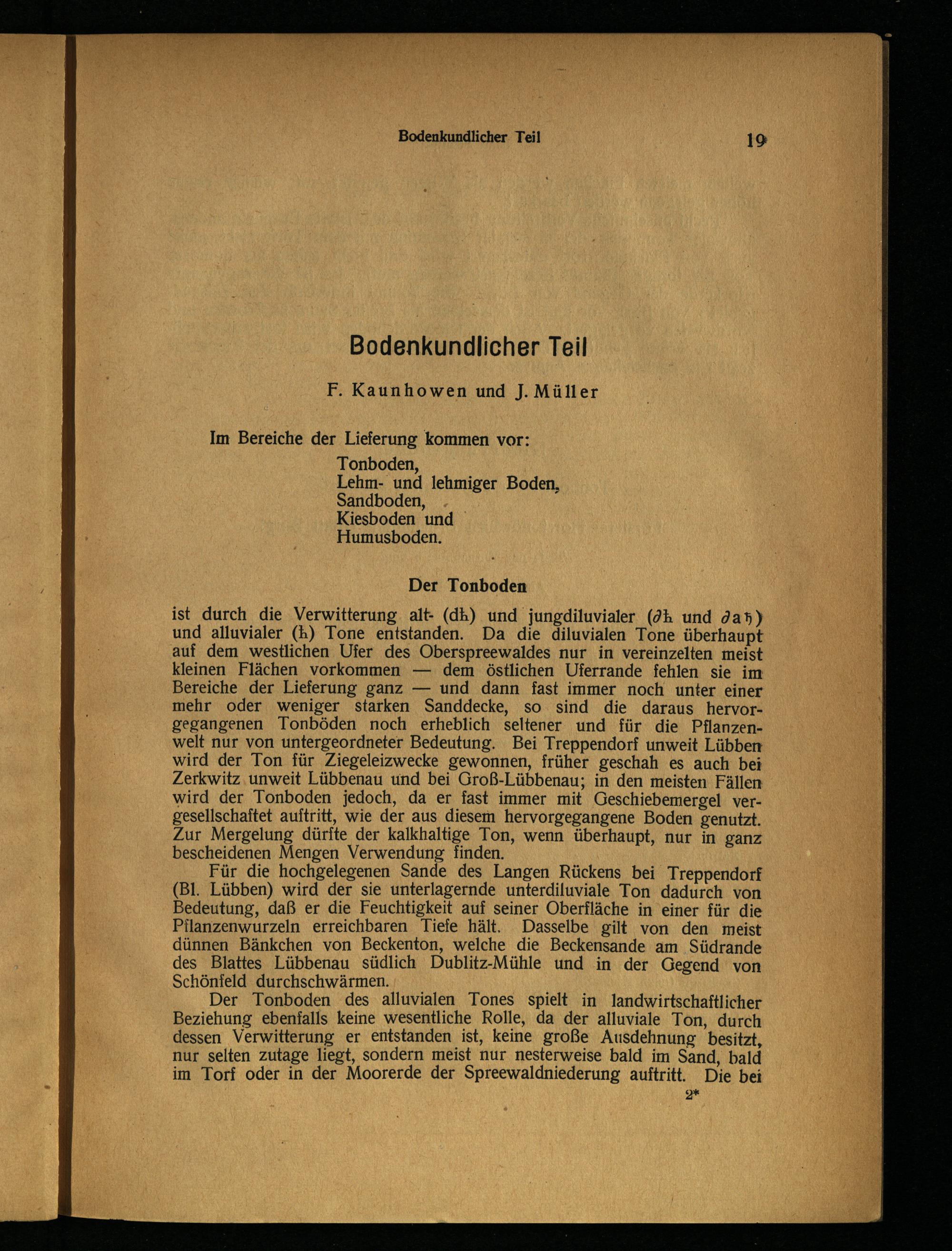 und alluvialer(k) Tone entstanden. Da die diluvialen Tone überhaupt auf dem westlichen Ufer des Oberspreewaldes nur in vereinzelten meist kleinen Flächen vorkommen— dem östlichen Uferrande fehlen sie im Bereiche der Lieferung ganz— und dann fast immer noch unter einer mehr oder weniger starken Sanddecke, so sind die daraus hervorgegangenen Tonböden noch erheblich seltener und für die Pflanzenwelt nur von untergeordneter Bedeutung. Bei Treppendorf unweit Lübben wird der Ton für Ziegeleizwecke gewonnen, früher geschah es auch bei Zerkwitz unweit Lübbenau und bei Groß-Lübbenau; in den meisten Fällen wird der Tonboden jedoch, da er fast immer mit Geschiebemergel vergesellschaftet auftritt, wie der aus diesem hervorgegangene Boden genutzt. Zur Mergelung dürfte der kalkhaltige Ton, wenn überhaupt, nur in ganz bescheidenen Mengen Verwendung finden.