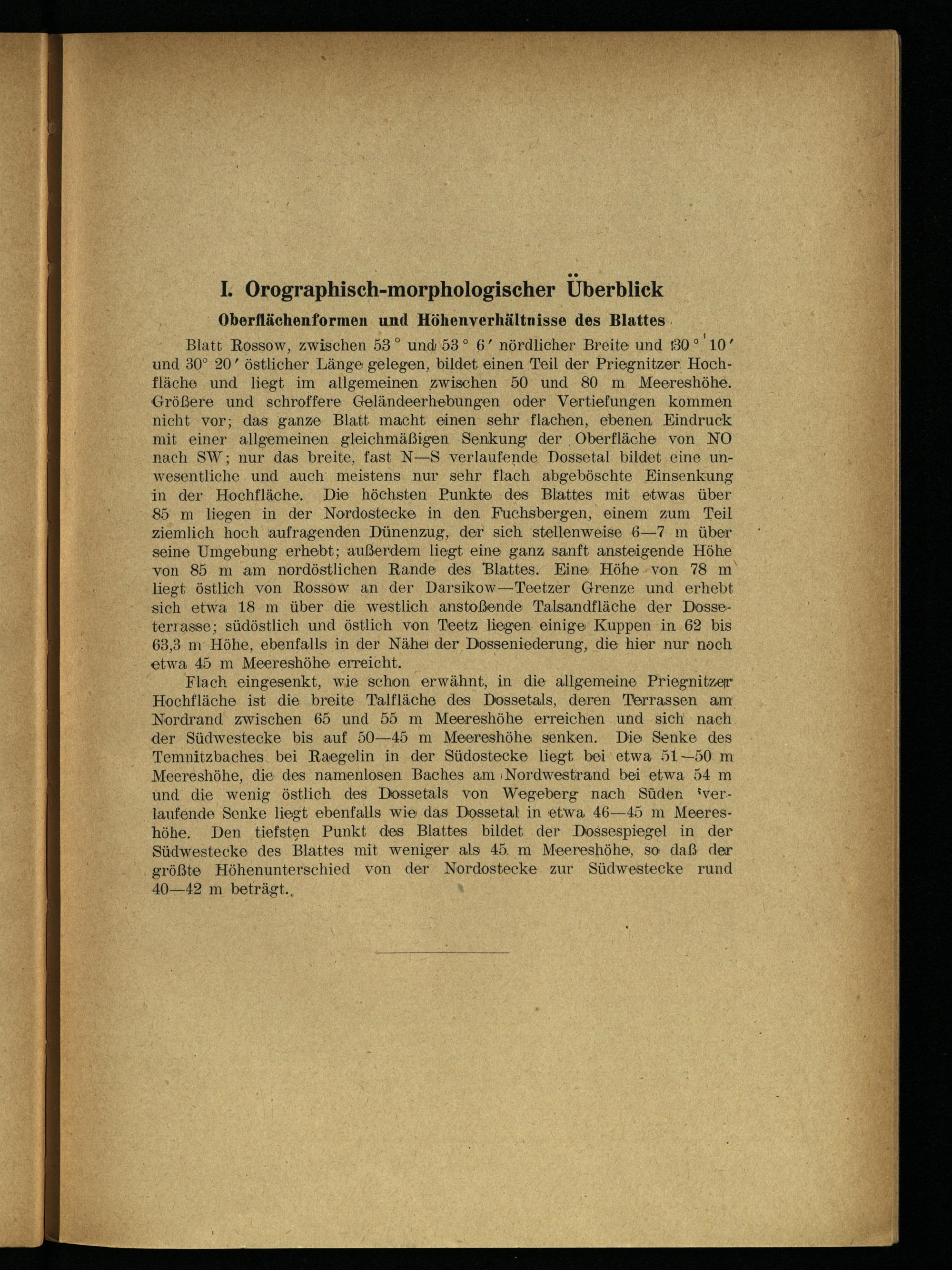 Flach eingesenkt, wie schon erwähnt, in die allgemeine Priegnitzer Hochfläche ist die breite Talfläche des Dossetals, deren Terrassen am Nordrand zwischen 65 und 55 m Meereshöhe erreichen und ‚sich nach der Südwestecke bis auf 50—45 m Meereshöhe senken. Die Senke des Temnitzbaches. bei Raegelin in der Südostecke liegt bei etwa 51—50 m Meereshöhe, die des namenlosen Baches am ıNordwestrand bei etwa 54 m und die wenig östlich des Dossetals von Wegeberg nach Süden*verlaufende Senke liegt ebenfalls wie das Dossetal in etwa 46—45 m Meereshöhe. Den tiefsten Punkt des Blattes bildet der Dossespiegel in der Südwestecke des Blattes mit weniger als 45. m Meereshöhe, so daß der größte Höhenunterschied von der Nordostecke zur Südwestecke rund 40—42 m beträgt.,