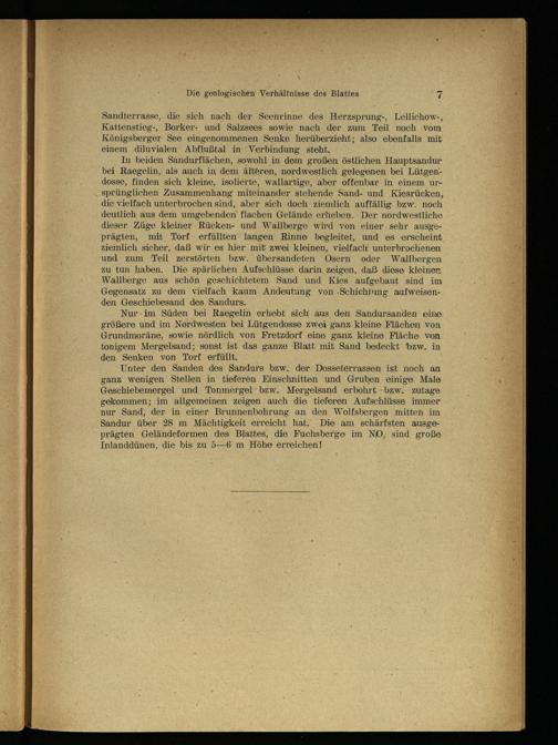 ganz wenigen‘ Stellen in tieferen Einschnitten und Gruben einige Male Geschiebemergel und Tonmergel‘bzw. Mergelsand erbohrt bzw. zutage gekommen; im allgemeinen zeigen auch die tieferen Aufschlüsse immer nur Sand, der in einer Brunnenbohrung an den Wolfsbergen ‚mitten im Sandur über 28 m Mächtigkeit erreicht hat. Die am schärfsten ausgeprägten Geländeformen des Blattes, die Fuchsberge im NO, sind große Inlanddünen, die bis zu 5—6 m Höhe erreichen!