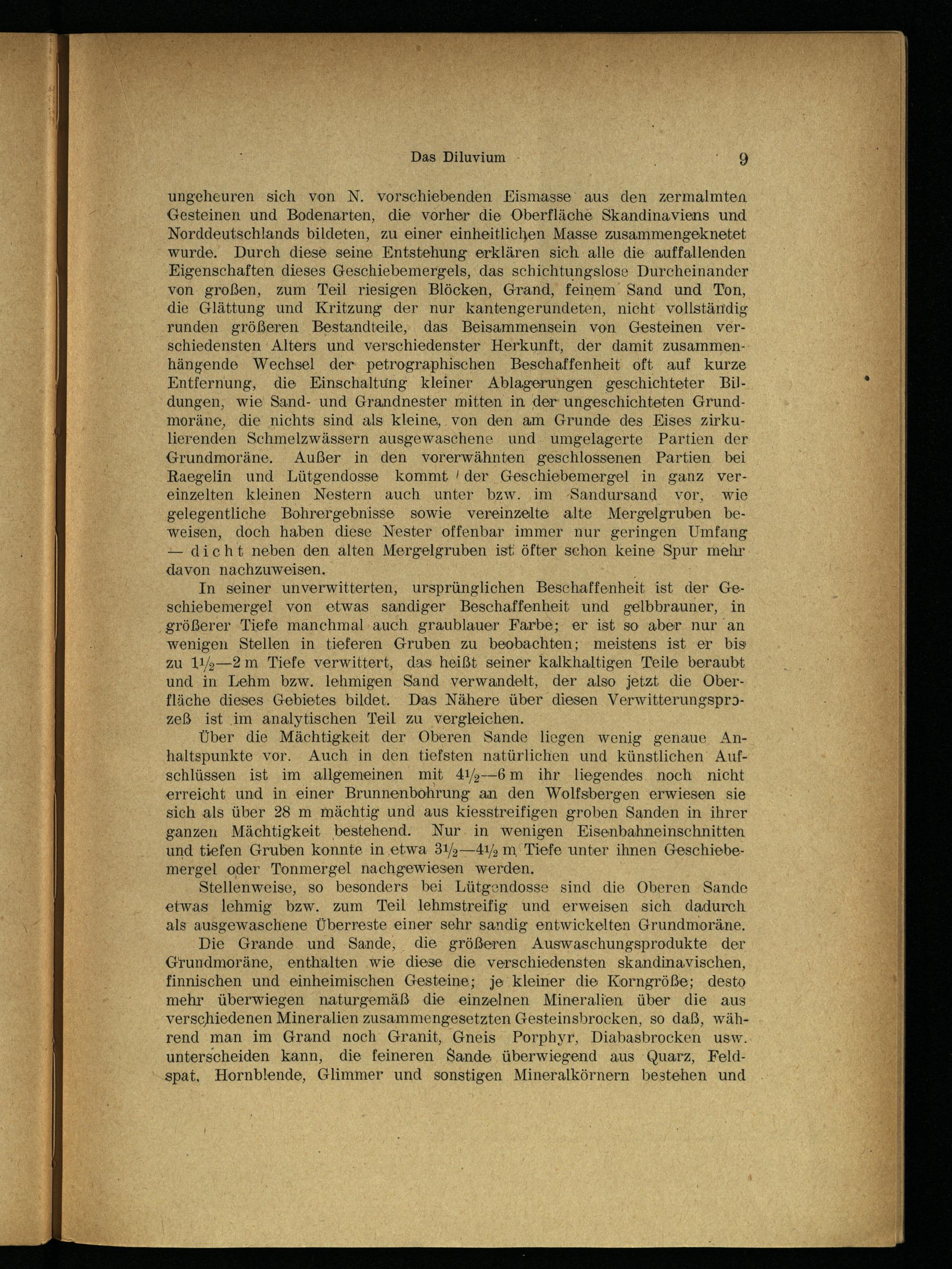 In seiner unverwitterten, ursprünglichen Beschaffenheit ist der Geschiebemergel von etwas sandiger Beschaffenheit und gelbbrauner, in größerer Tiefe manchmal auch graublauer Farbe; er ist so aber nur an wenigen Stellen in tieferen Gruben zu beobachten; meistens ist er bis zu 112—2 m Tiefe verwittert, das heißt seiner kalkhaltigen Teile beraubt und in Lehm bzw. lehmigen Sand verwandelt, der also jetzt die Oberfläche dieses Gebietes bildet. Das Nähere über diesen Verwitterungsprozeß ist im analytischen Teil zu vergleichen.