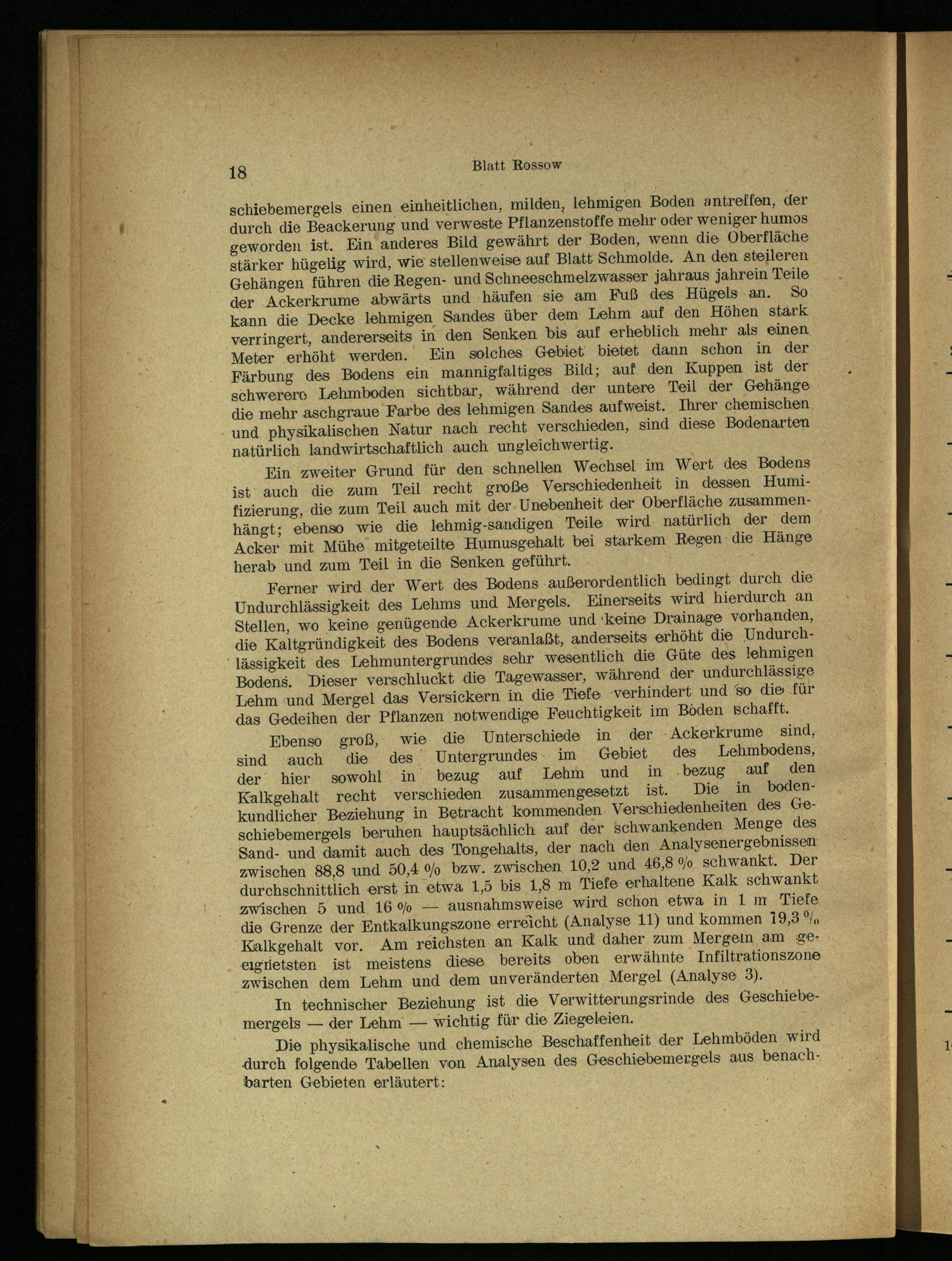 Ferner wird der Wert des Bodens außerordentlich bedingt durch die Undurchlässigkeit des Lehms und Mergels . Einerseits wird hierdurch an Stellen, wo keine genügende Ackerkrume und‘keine Drainage vorhanden, die Kaltgründigkeit des Bodens veranlaßt, anderseits erhöht die Undurch' lässigkeit des Lehmuntergrundes sehr wesentlich die Güte des lehmigen Bodens. Dieser verschluckt die Tagewasser, während der undurchlässige Lehm und Mergel das Versickern in die Tiefe verhindert und so die für das Gedeihen der Pflanzen notwendige Feuchtigkeit im Böden schafft.