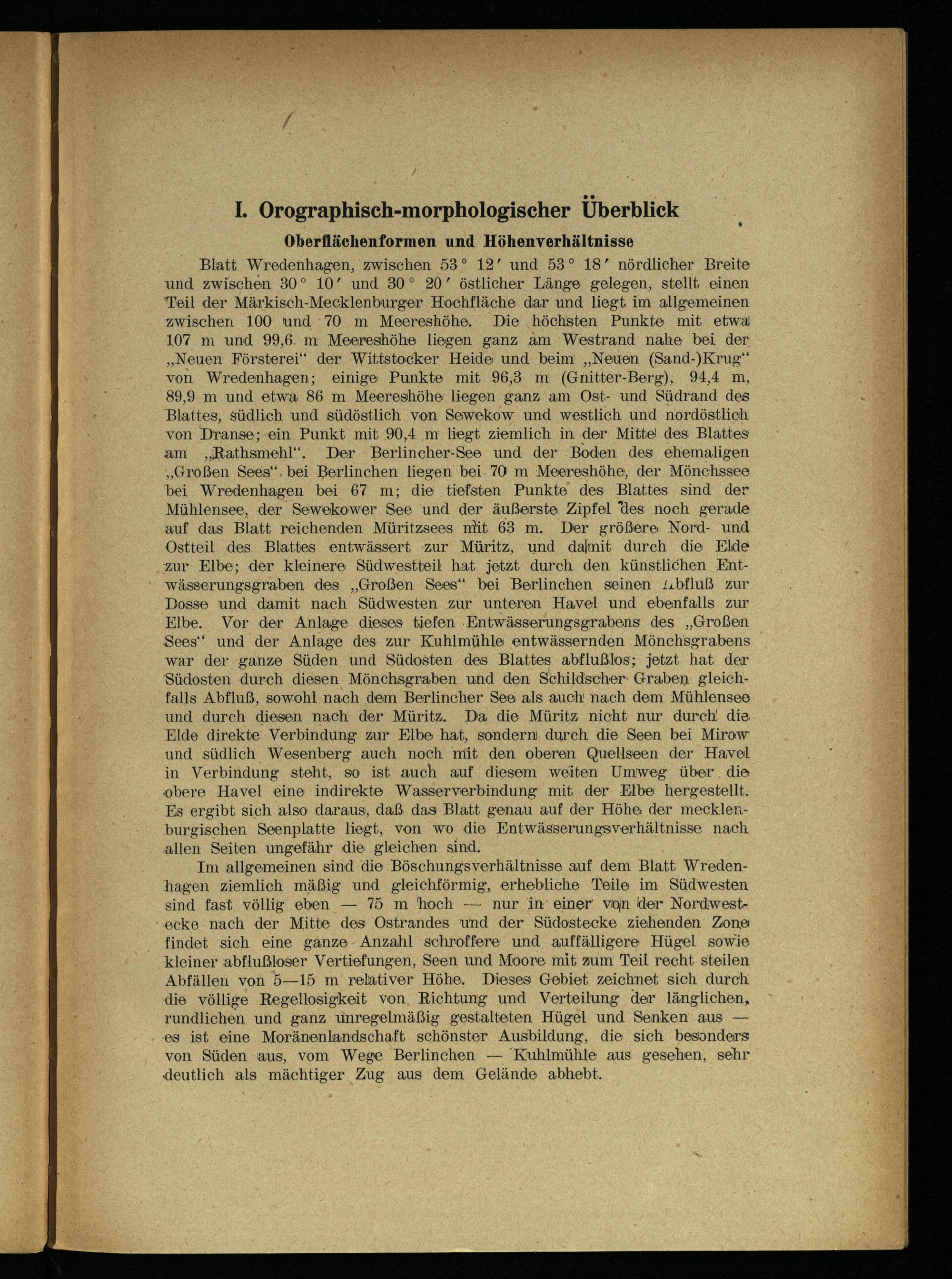 Blatt Wredenhagen, zwischen 53° 12’ und 53° 18’ nördlicher Breite und zwischen 30° 10’ und 30° 20’ östlicher Länge gelegen, stellt einen Teil der Märkisch-Mecklenburger Hochfläche dar und liegt im allgemeinen zwischen 100 und 70 m Meereshöhe. Die höchsten Punkte mit etwa 107 m und 99,6. m Meereshöhe liegen ganz am Westrand nahe bei der „Neuen Försterei‘“ der Wittstocker Heide und beim„Neuen(Sand-)Krug“‘ von Wredenhagen ; einige Punkte mit 96,3 m.(Gnitter-Berg), 94,4 m, 89,9 m und etwa 86 m Meereshöhe liegen ganz am Ost- und Südrand des ‘Blattes, südlich und südöstlich von Sewekow und westlich und nordöstlich von Dranse;-ein Punkt mit 90,4 m liegt ziemlich in.der Mitte! des Blattes am„Rathsmehl‘. Der Berlincher-See und der ‚Boden des ehemaligen „Großen Sees‘. bei Berlinchen liegen bei. 70 m Meereshöhe, der Mönchssee bei Wredenhagen bei 67 m; die tiefsten Punkte des Blattes sind der Mühlensee, der Sewekower See und der äußerste Zipfel des noch gerade auf das Blatt reichenden Müritzsees mit 63 m. Der größere Nord- und Ostteil des Blattes entwässert zur Müritz, und damit durch die Elde zur Elbe ; der kleinere Südwestteil hat jetzt durch den künstlichen Ent‘ wässerungsgraben. des„Großen Sees‘ bei Berlinchen seinen /.bfluß zur Dosse und damit nach Südwesten. zur unteren Havel und ebenfalls zur Elbe . Vor der Anlage dieses tiefen Entwässerungsgrabens des„Großen Sees‘ und der Anlage des zur Kuhlmühle entwässernden Mönchsgrabens war der ganze Süden und Südosten des Blattes abflußlos; jetzt hat der Südosten durch diesen Mönchsgraben und den Schildscher- Graben gleichfalls Abfluß, sowohl nach dem Berlincher See als auch' nach dem Mühlensee und durch diesen nach der Müritz . Da die Müritz nicht nur durch die Elde direkte Verbindung zur Elbe hat, sondern. durch. die. Seen bei Mirow und südlich Wesenberg auch noch mit den oberen Quellseen der Havel in Verbindung steht, so ist auch auf diesem weiten Umweg über. die obere Havel eine indirekte Wasserverbindung mit der Elbe hergestellt. Es ergibt sich also daraus, daß das Blatt genau auf der Höhe: der mecklenburgischen Seenplatte liegt, von wo die Entwässerungsverhältnisse nach allen Seiten ungefähr die gleichen sind.