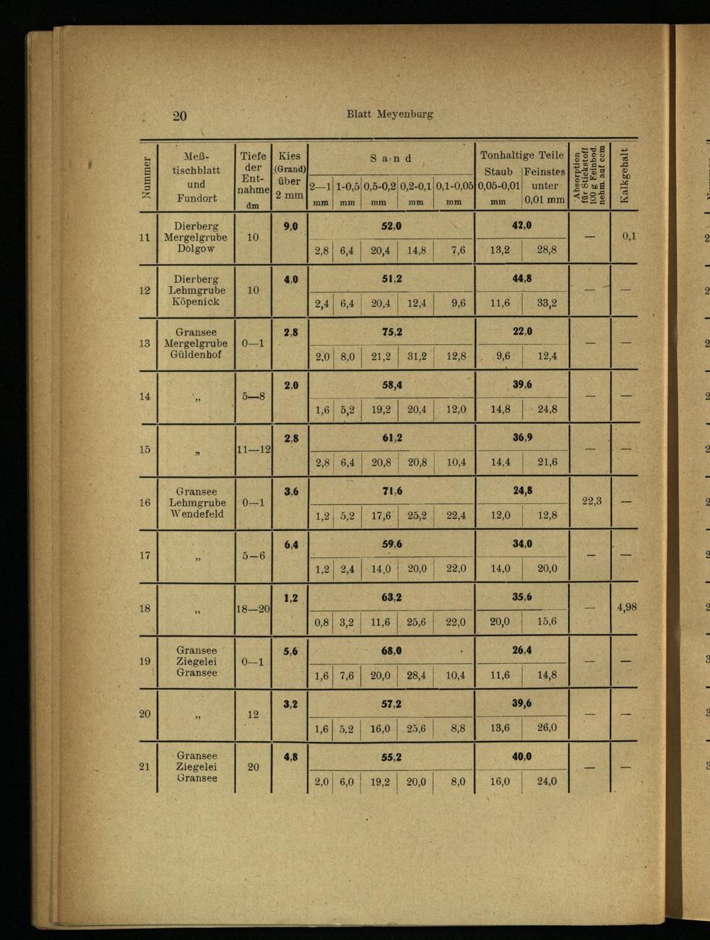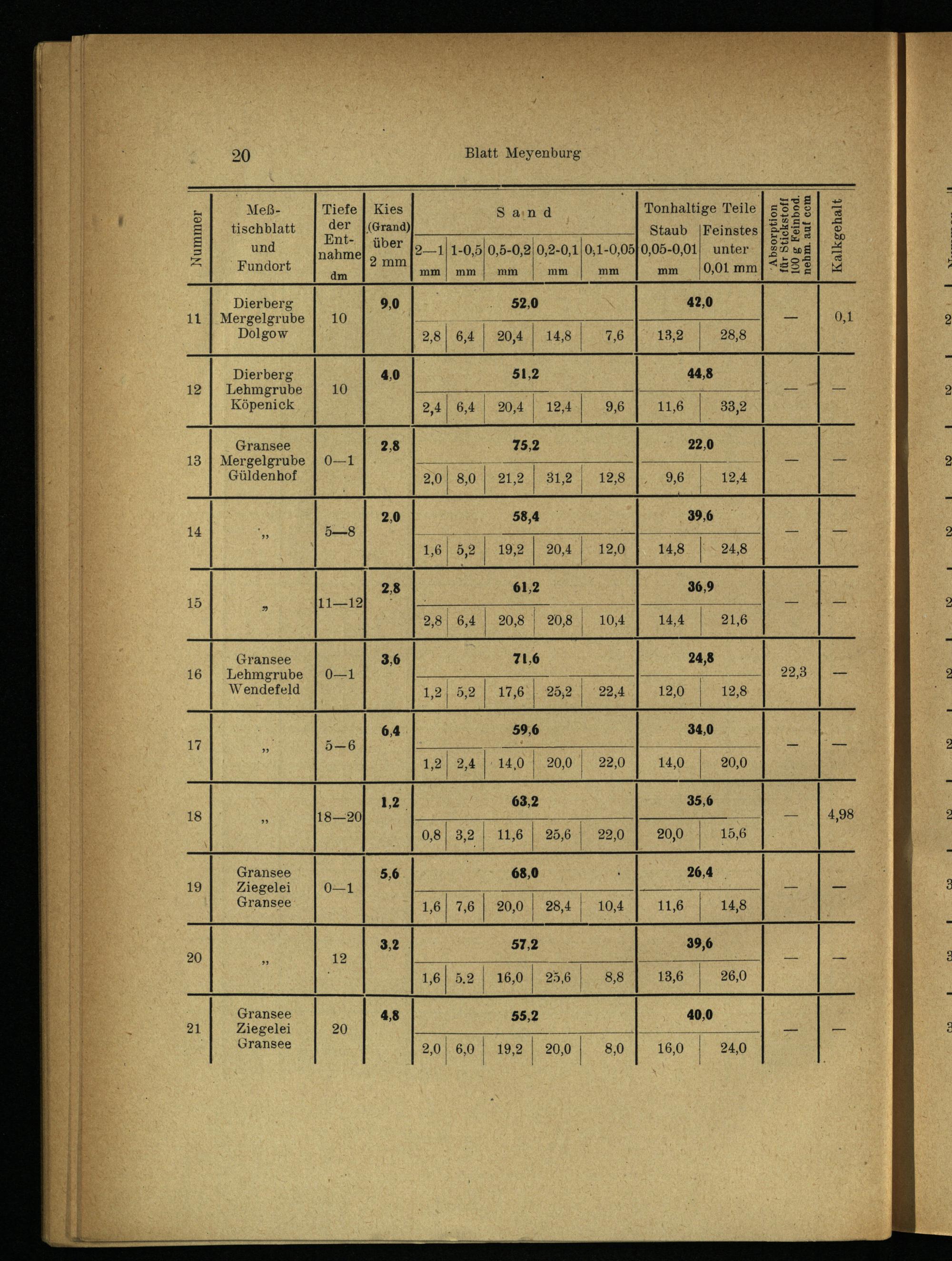Meß- Tiefe| Kies S aın d Tonhaltige Teile tischblatt Dt(Grand) A Staub|Feinstes nt-|]| und| mel Aber 21 1-0,5/0,5-0,2 0,2-0,1/0,1-0,05[0,05-0,01/ unter Fundort 2 mm