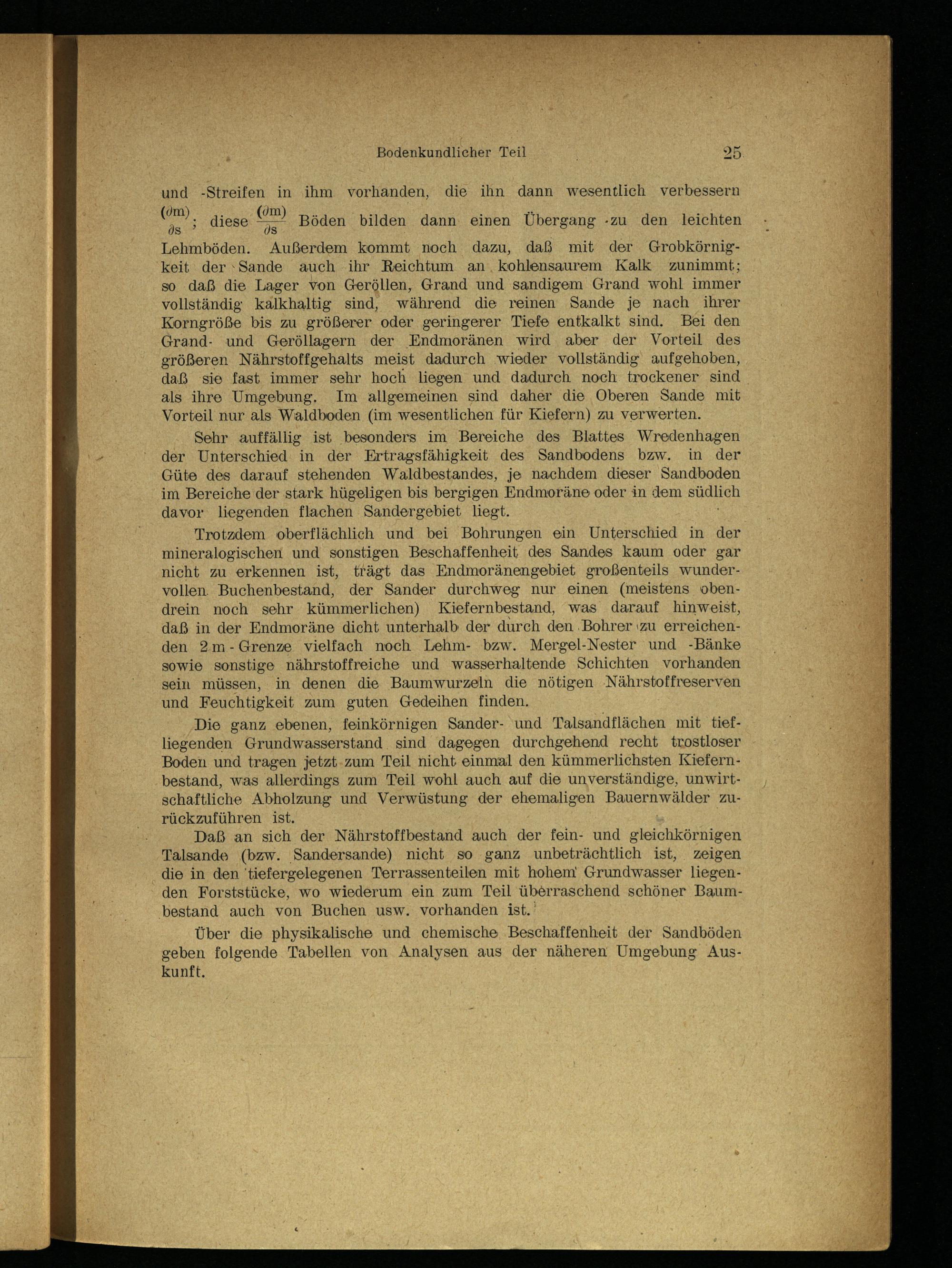 Über die physikalische und chemische Beschaffenheit der Sandböden geben folgende Tabellen von Analysen aus der näheren Umgebung Auskunft.