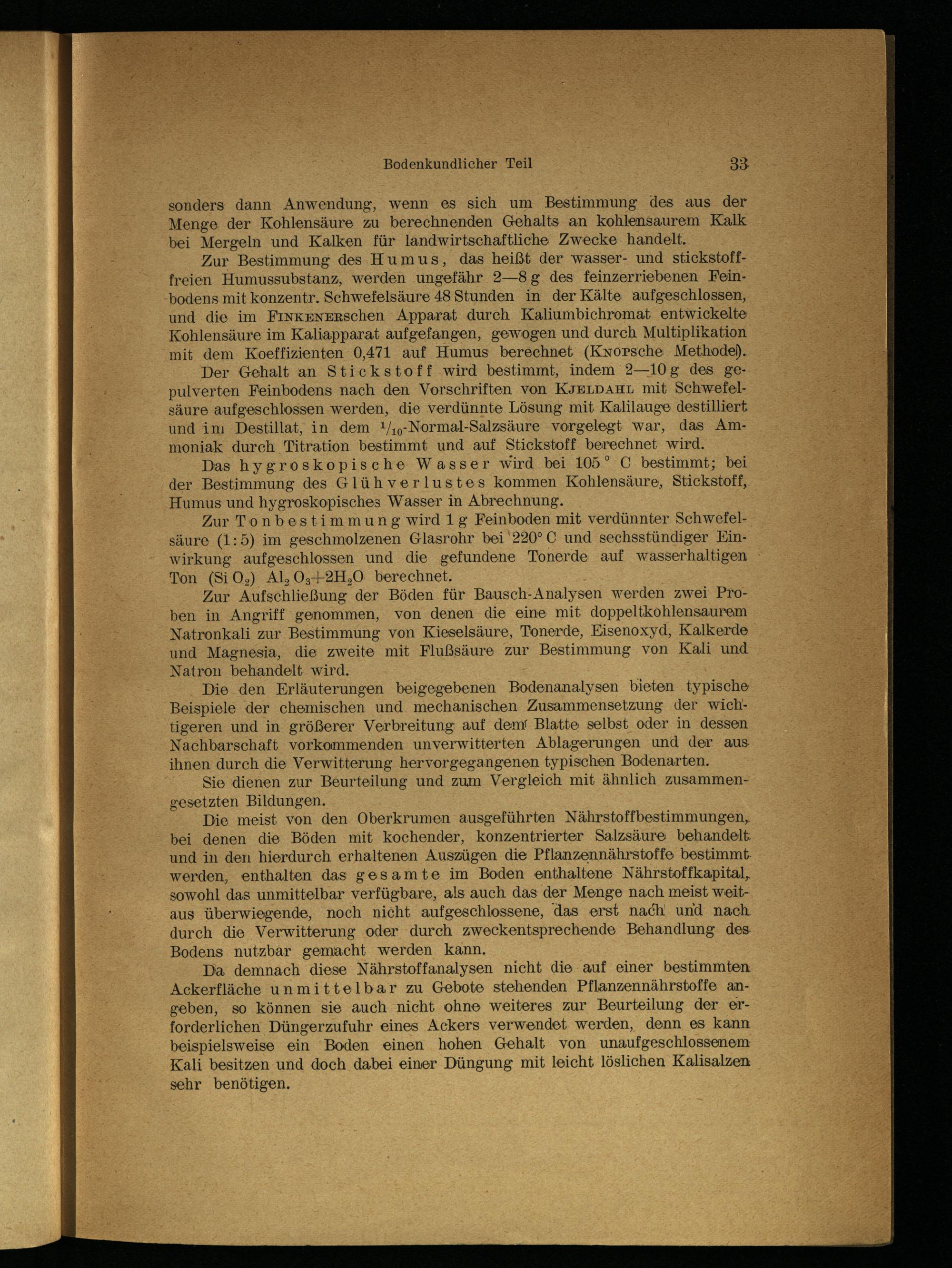 Der Gehalt an Stickstoff wird bestimmt, indem 2—10g des gepulverten Feinbodens nach den Vorschriften von KJELDAHL mit Schwefelsäure aufgeschlossen werden, die verdünnte Lösung mit Kalilauge destilliert und im Destillat, in dem 1/,0-Normal-Salzsäure vorgelegt war, das Ammoniak durch Titration bestimmt und auf Stickstoff berechnet wird.