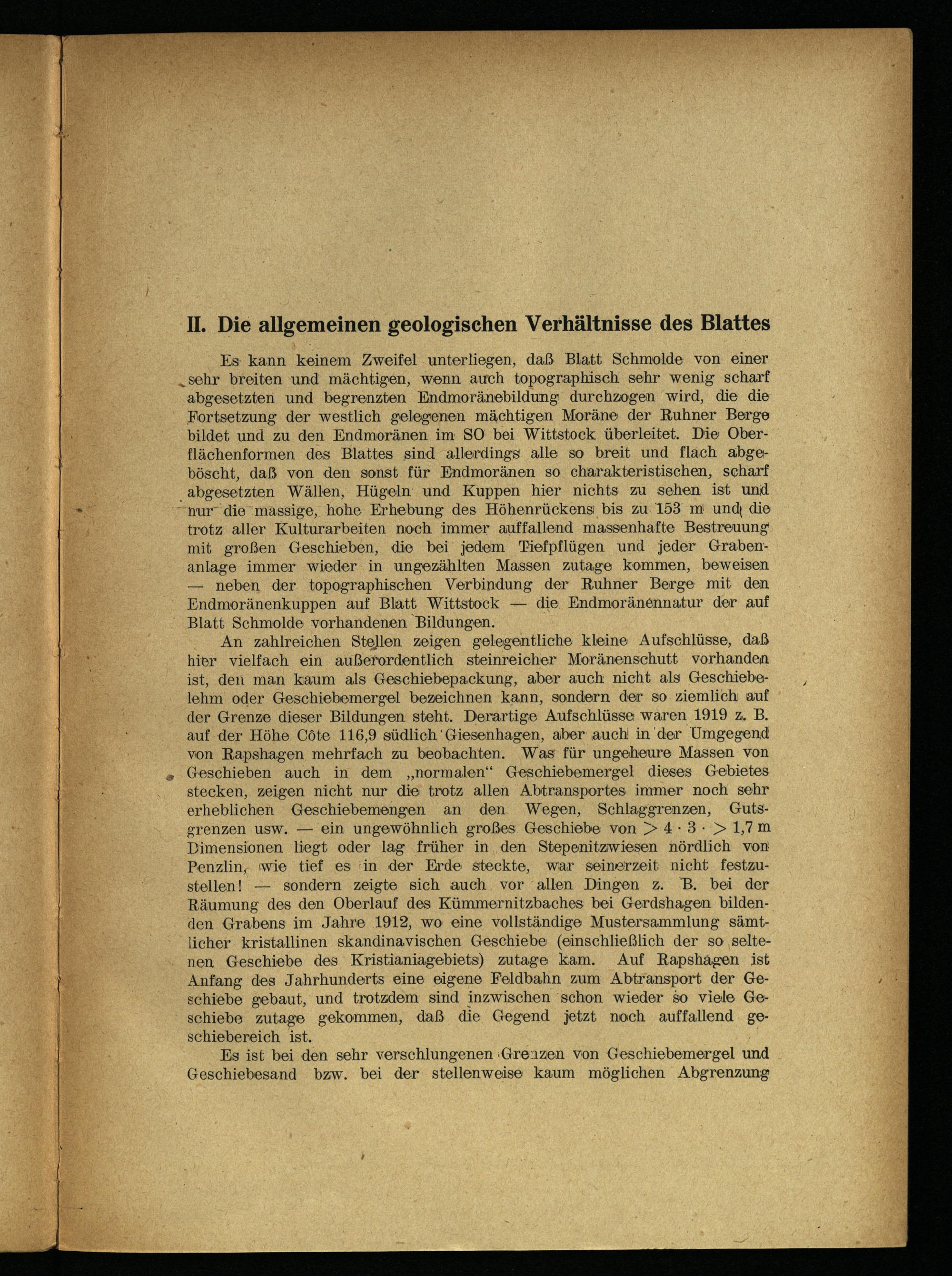 Es kann keinem Zweifel unterliegen, daß Blatt Schmolde von einer „sehr breiten und mächtigen, wenn auch topographisch sehr wenig scharf abgesetzten und begrenzten Endmoränebildung durchzogen wird, die die Fortsetzung der westlich gelegenen mächtigen Moräne der Ruhner Berge bildet und zu den Endmoränen im SO bei Wittstock überleitet. Die Oberflächenformen des Blattes sind allerdings alle so breit und flach abgeböscht, daß von den sonst für Endmoränen so charakteristischen, scharf _abgesetzten Wällen, Hügeln‘ und Kuppen hier nichts zu sehen ist und nur“ die massige, hohe Erhebung des Höhenrückens bis zu. 153 m' und, die trotz aller Kulturarbeiten noch immer auffallend massenhafte Bestreuung mit großen Geschieben, die bei jedem"Tiefpflügen und jeder Grabenanlage immer wieder in ungezählten Massen zutage kommen, beweisen — neben der topographischen Verbindung der Ruhner Berge mit den Endmoränenkuppen auf Blatt Wittstock — die. Endmoränennatur der auf ” Blatt Schmolde vorhandenen Bildungen.