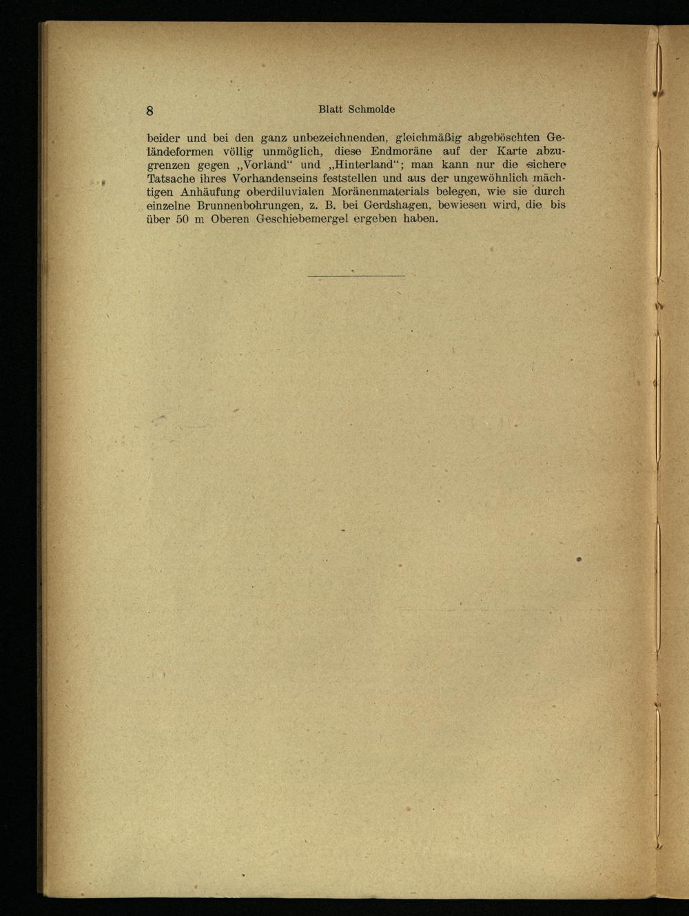 beider und bei den ganz unbezeichnenden, gleichmäßig abgeböschten Geländeformen völlig unmöglich, diese Endmoräne auf der Karte abzugrenzen gegen ‚„Vorland‘“ und„Hinterland‘; man kann nur die sichere Tatsache ihres Vorhandenseins feststellen und aus der ungewöhnlich mächtigen Anhäufung oberdiluvialen Moränenmaterials belegen, wie sie durch einzelne Brunnenbohrungen, z. B. bei Gerdshagen , bewiesen wird, die bis über 50 m Oberen Geschiebemergel ergeben haben.