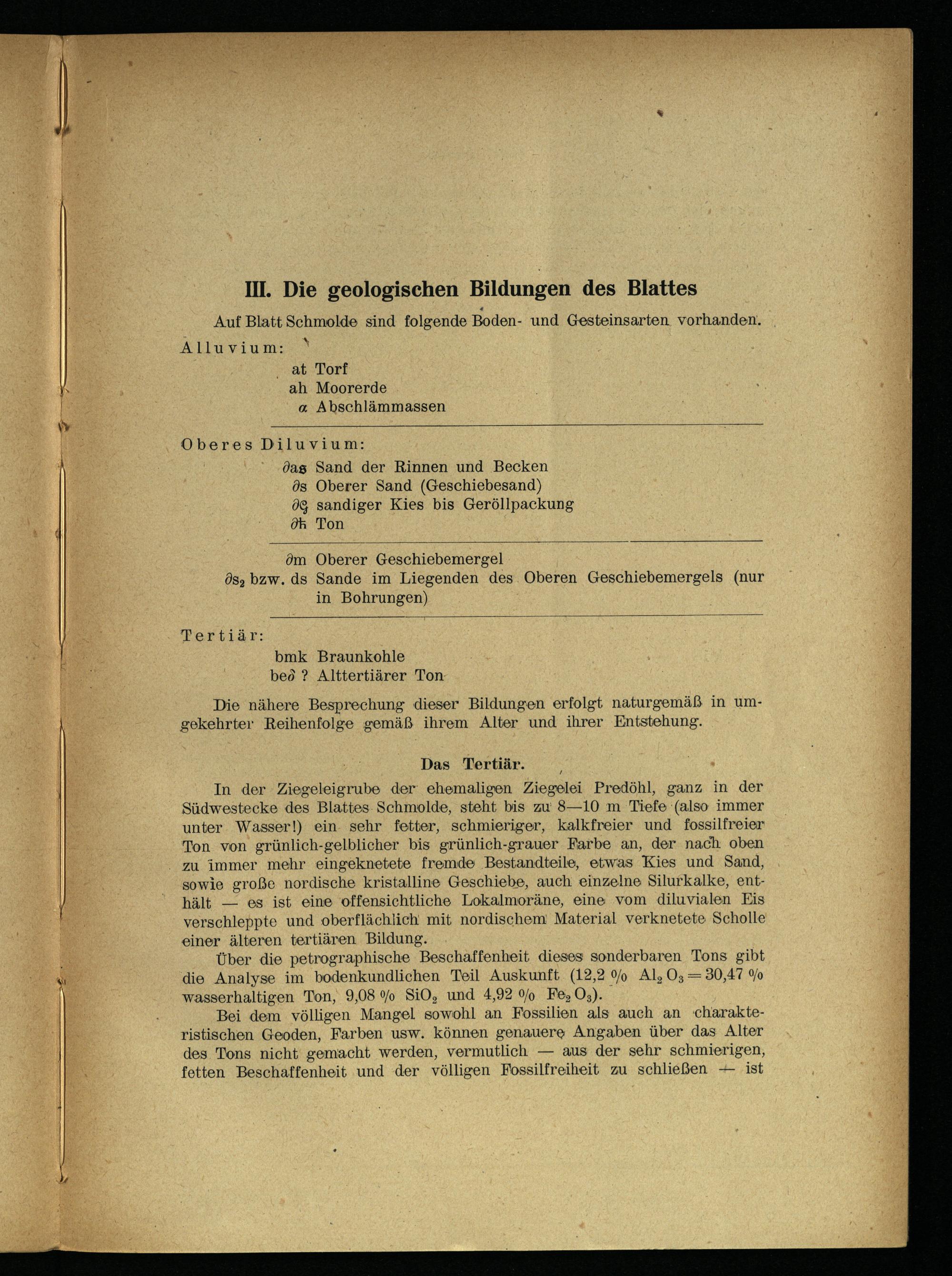 In der Ziegeleigrube der ehemaligen Ziegelei Predöhl, ganz in der Südwestecke des Blattes. Schmolde, steht bis zu 8—10 m Tiefe(also immer unter. Wasser!) ein. sehr fetter, schmieriger, kalkfreier und fossilfreier Ton. von grünlich-gelblicher bis grünlich-grauer Farbe an, der nach oben