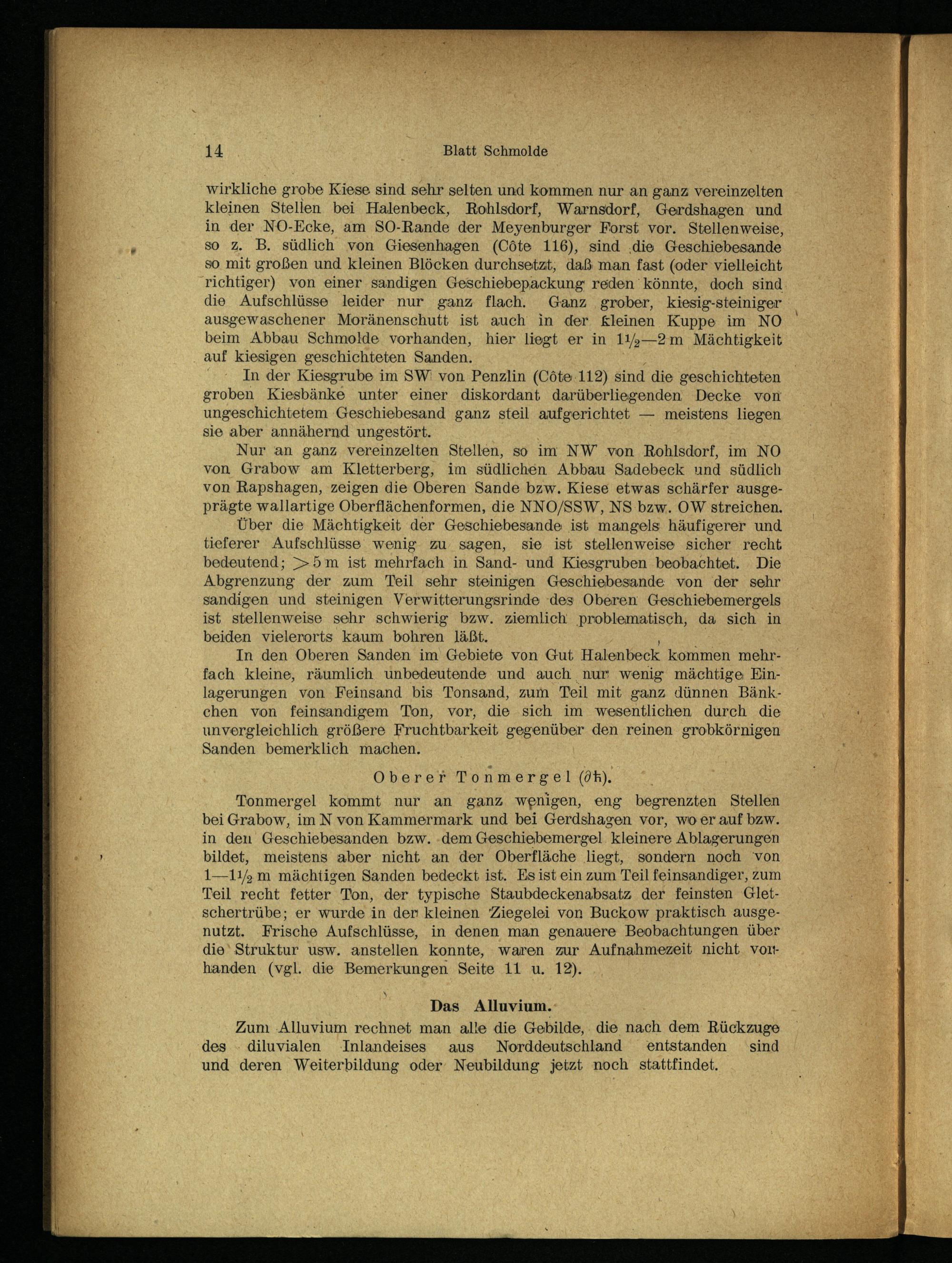 Über die Mächtigkeit der Geschiebesande ist mangels häufigerer und tieferer Aufschlüsse‘ wenig. zu sagen, sie ist stellenweise sicher recht bedeutend;>5m ist mehrfach in Sand- und Kiesgruben beobachtet. Die Abgrenzung der zum Teil sehr steinigen Geschiebesande von der sehr sandigen und steinigen Verwitterungsrinde des Oberen Geschiebemergels ist stellenweise sehr schwierig bzw. ziemlich problematisch, da sich in beiden vielerorts kaum bohren läßt.