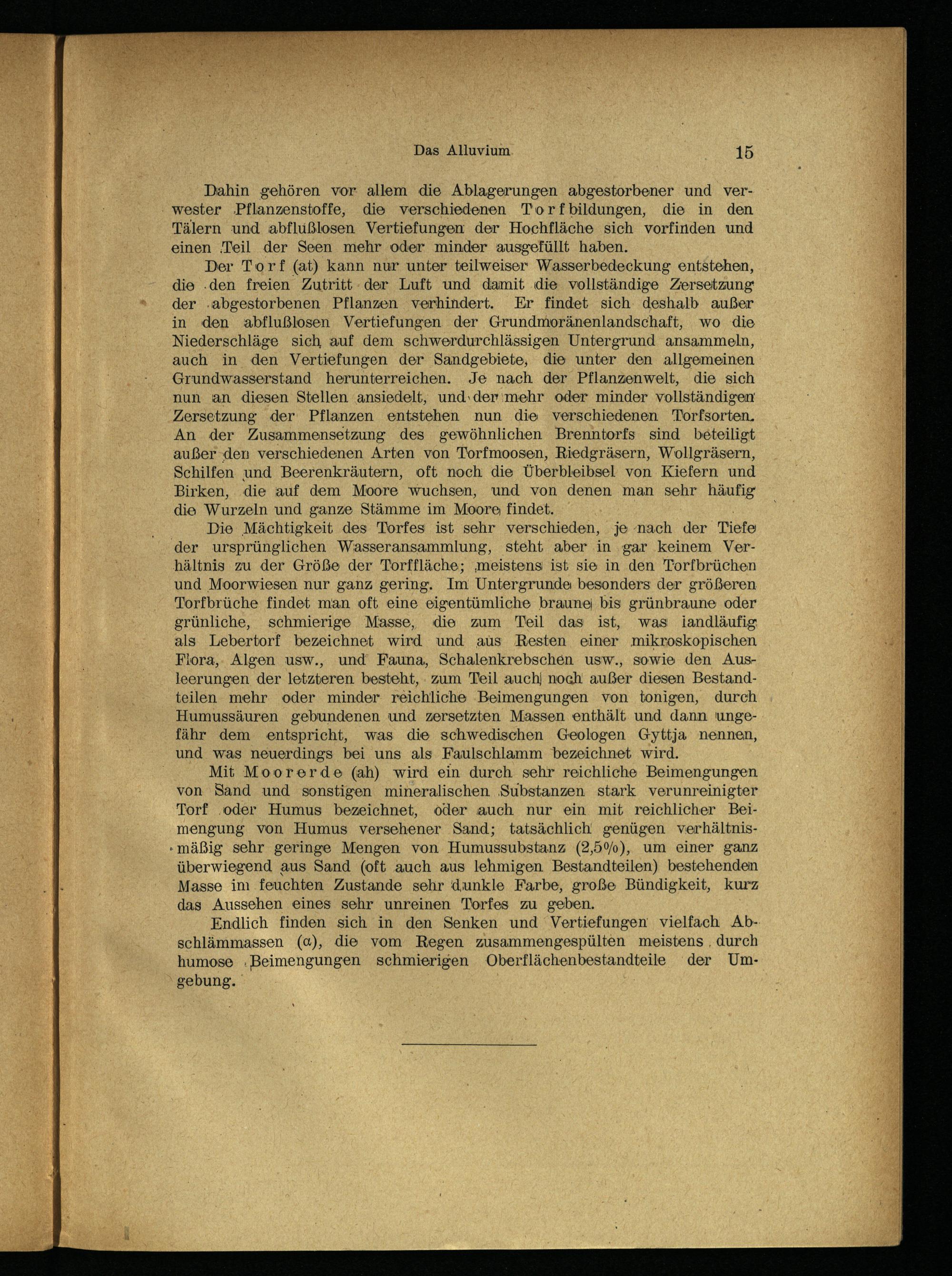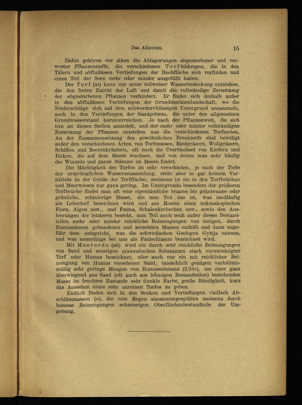 Die Mächtigkeit des Torfes ist sehr verschieden, je nach der Tiefe der ursprünglichen Wasseransammlung, steht aber in ‚gar keinem Verhältnis zu der Größe der Torffläche; ‚meistens ist sie in den Torfbrüchen und Moorwiesen nur ganz gering. Im Untergrunde besonders der größeren Torfbrüche findet man oft eine eigentümliche braune| bis grünbraune oder grünliche, schmierige Masse, die zum Teil das ist, was landläufig als Lebertorf bezeichnet wird und aus Resten einer mikroskopischen Flora, Algen usw., und’ Fauna, Schalenkrebschen usw., sowie den Ausleerungen der letzteren besteht,. zum Teil auch) noch außer diesen Bestandteilen mehr oder minder reichliche Beimengungen von tonigen, durch Humussäuren gebundenen und zersetzten Massen enthält und dann'ungefähr dem entspricht, was die schwedischen Geologen Gyttja nennen, und was neuerdings bei uns als Faulschlamm bezeichnet wird.