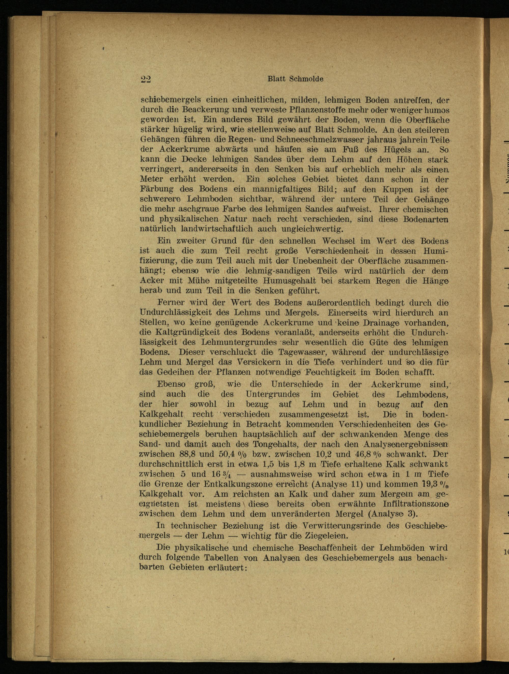 Ferner wird der Wert des Bodens außerordentlich bedingt durch die Undurchlässigkeit des Lehms und Mergels . Einerseits wird hierdurch an Stellen, wo keine genügende Ackerkrume und‘keine Drainage vorhanden, die Kaltgründigkeit des Bodens veranlaßt, anderseits erhöht die Undurchlässigkeit des Lehmuntergrundes‘sehr wesentlich die Güte des lehmigen Bodens. Dieser verschluckt die Tagewasser, während der undurchlässige Lehm und Mergel das Versickern in die Tiefe verhindert und so die für das Gedeihen der Pflanzen notwendige Feuchtigkeit im Boden schafft.