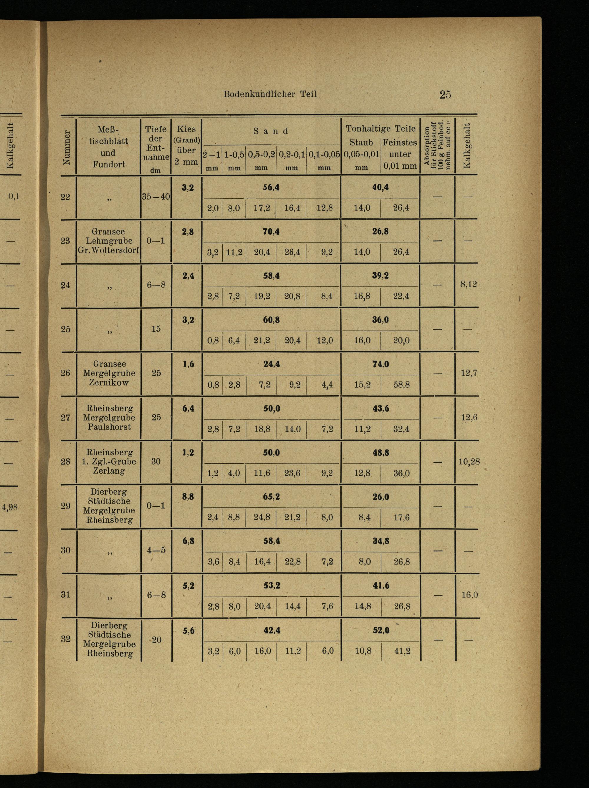 . Meß- Tiefe| Kies Sand Tonhaltige Teile 5333€ S| tischblatt ne(Grand) os Staub|Feinstes 2353® nt-.. a;& : und nahme nn 2—1 1-0,5|0,5-0,2/ 0,2-0,1/0,1-0,05/0,05-0,01/ unter| z2|= © Fundort dm MI am 1 mm| mm| mm mm mm 0,01 mm 7883|= 3,2 56,4 40,4 22© 35—40 rn Or En 20/80| 172| 16,4| 138 14,0 26,4 Gransee 2,8 70,4 26,8 23| Lehmgrube| 0—1; nm ze— SS Gr. Woltersdorf 3,2 /11.2/ 20,4 26,4 9,2 14,0 26,4 2,4 58,4 39,2 24 Rn 6—8:. N— A812 281 7,21 19,21 20,8 8,4 16,8 22,4 3,2 60,8 36,0 25 Sn 15. SE— es 0,8| 6,4| 21,2| 20,4| 12,0 16,0 20,0 Gransee 1,6 24,4 74,0 26| Mergelgrube| 25: N— 12,7 Zernikow 081.28| 721 931 44 15,2 58,8 Rheinsberg 6,4 50,0 43,6 27| Mergelgrube 25 zn En Ss AM— 12:6 Paulshorst 28| 7,2| 18,8| 14,0 7,2 1n2 32,4 || Rheinsberg 1:2 50,0 48,8 28| 1. Zgl.-Grube| 30— 110,28 Zerlang 1,21. 4,0] 116.1 286 9,2 12:8.| 360 Dierberg Städtische|n_,|** 65,2 26,0 Mergelgrube ie a Dr A Rheinsberg 24| 8,8| 24,8|. 21,2 8,0 8,4 17,6 6,8 58,4 34,8 30 7 4—5; Zn a 3,6 8,4| 16,4| 22,8 7,2 8,0 26,8 53,2 41,6 nn— 1160 | 8,0| 20,4| 144 7,6 14,8 26,8 Dierberg ga Städtische|„2] 79 42,4 52,0 N Mergelgrube)|% Ol En en De Rheinsberg 3,2| 6,0 16,0| 11,2 6,0 10,8 41,2
