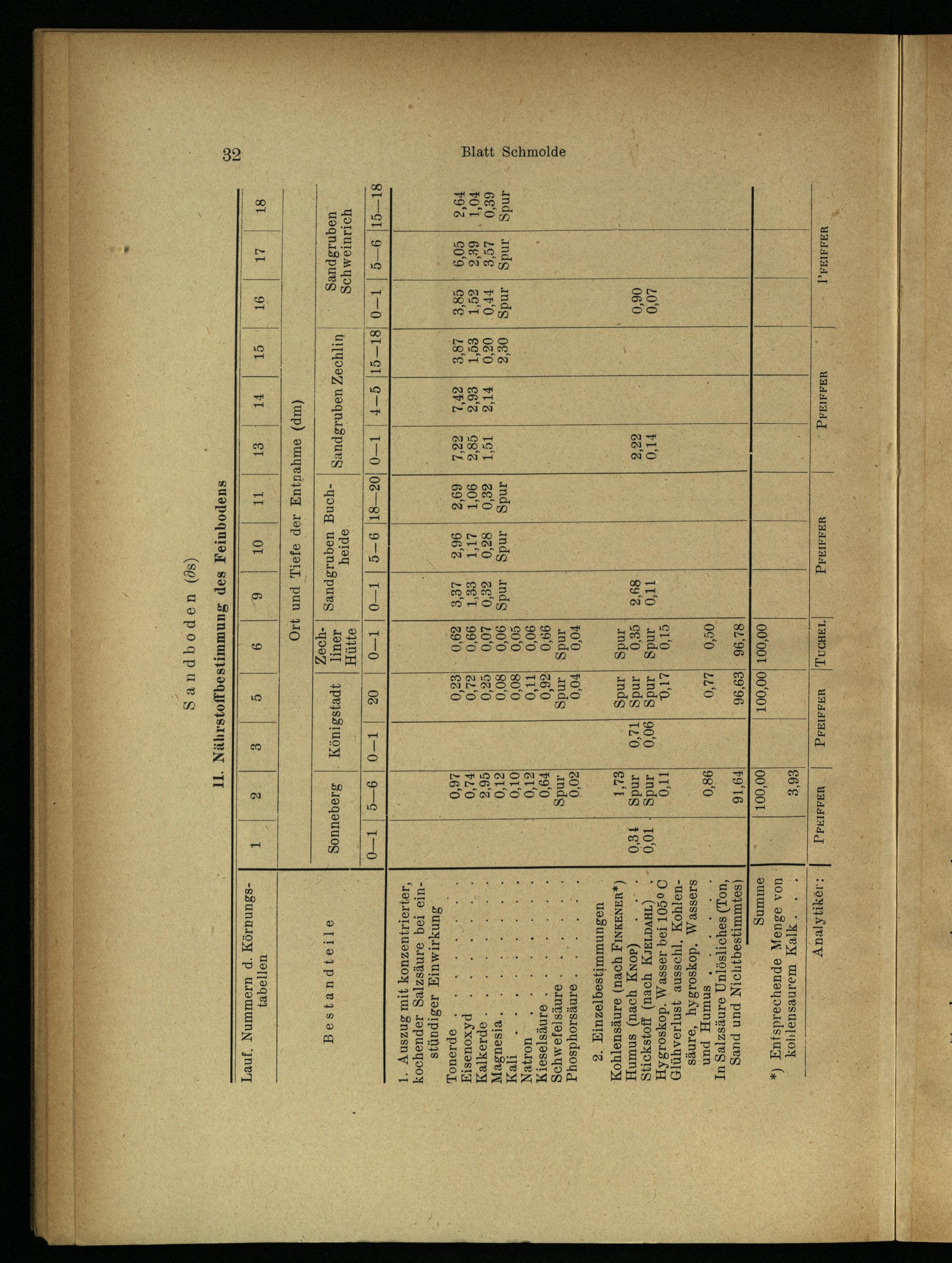 Kohlensäure(nach FINKENER*) Humus(nach Knorr ).. Stickstoff(nach KJELDAHL) Hygroskop. Wasser bei 105° C Glühverlust ausschl, Kohlensäure, hygroskop. Wassers und Humus ‚;- 2... In Salzsäure Unlösliches(Ton, Sand und Nichtbestimmtes)