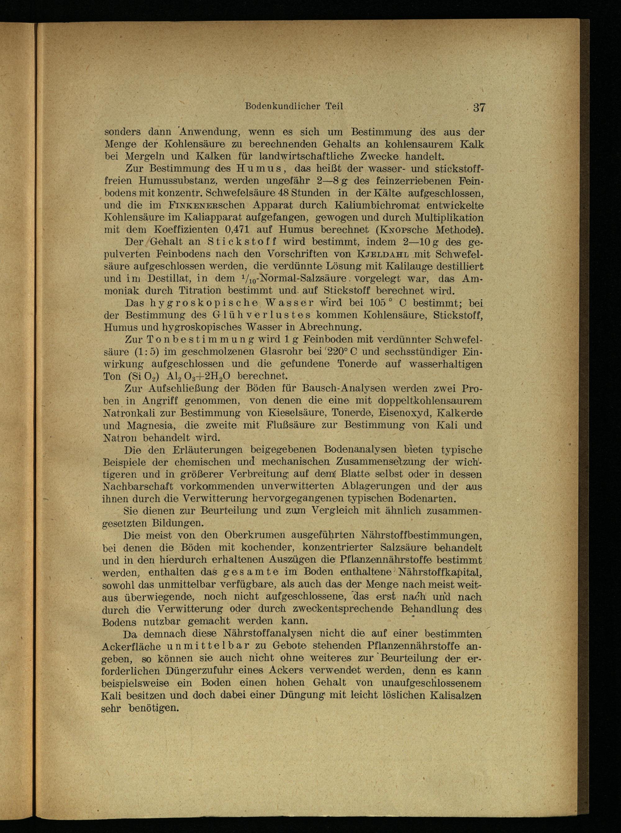 Da demnach diese Nährstoffanalysen nicht die auf einer bestimmten ‚Ackerfläche unmittelbar zu Gebote stehenden Pflanzennährstoffe angeben, so können sie auch nicht ohne weiteres zur Beurteilung der erforderlichen Düngerzufuhr eines Ackers verwendet werden, denn es kann beispielsweise ein Boden einen hohen Gehalt von unaufgeschlossenem Kali besitzen und doch dabei einer Düngung‘ mit leicht löslichen Kalisalzen sehr benötigen.