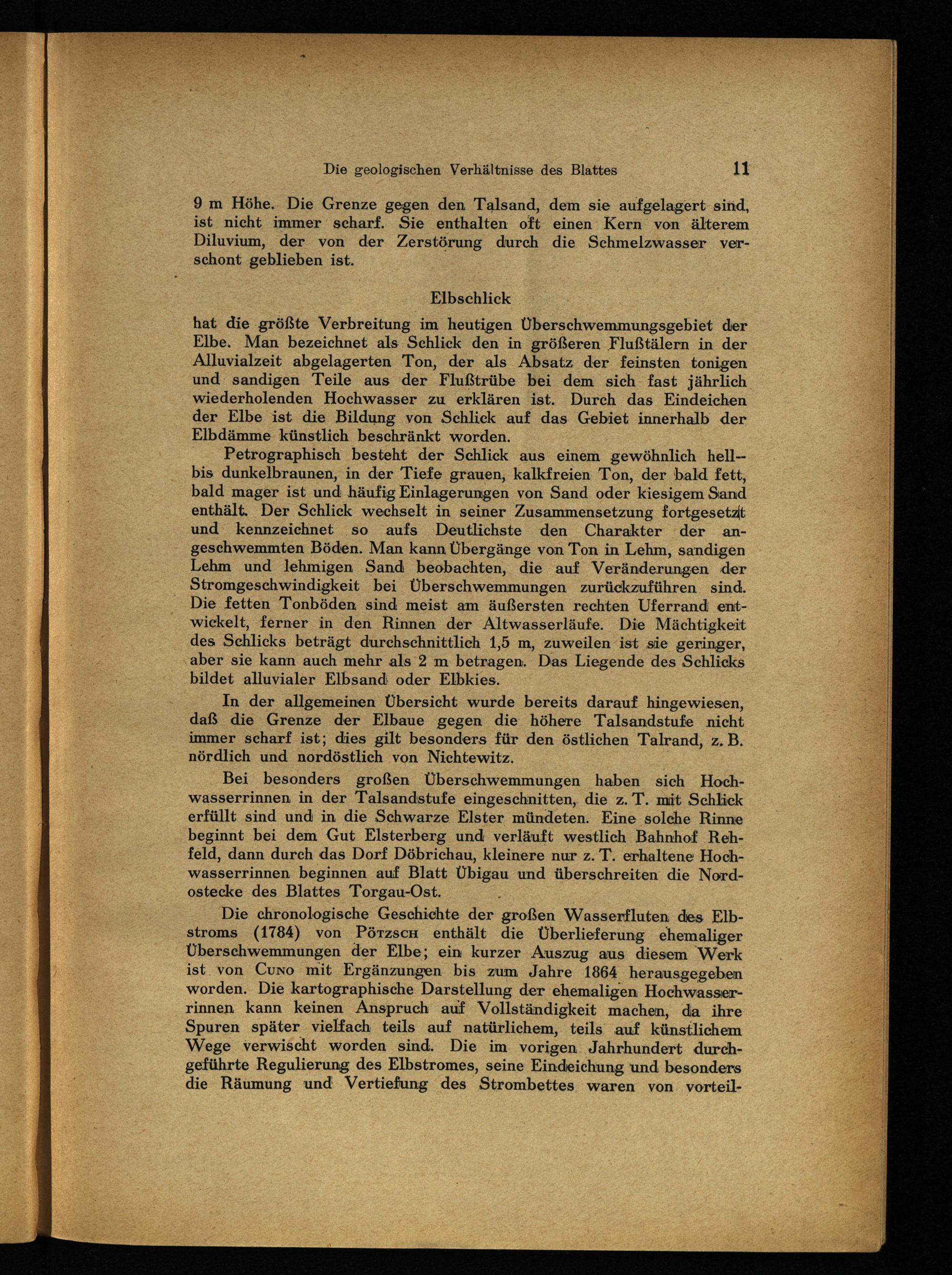 Petrographisch besteht der Schlick aus einem gewöhnlich hell-bis dunkelbraunen, in der Tiefe grauen, kalkfreien Ton, der bald fett, bald mager ist und häufig Einlagerungen von Sand oder kiesigem Sand enthält. Der Schlick wechselt in seiner Zusammensetzung fortgesetzlt und kennzeichnet so aufs Deutlichste den Charakter der an_ geschwemmten Böden. Man kann Übergänge von Ton in Lehm, sandigen Lehm und lehmigen Sand beobachten, die auf Veränderungen der Stromgeschwindigkeit bei Überschwemmungen zurückzuführen sind. Die fetten Tonböden sind meist am äußersten rechten Uferrand entwickelt, ferner in den Rinnen der Altwasserläufe. Die Mächtigkeit des Schlicks beträgt durchschnittlich 1,5 m, zuweilen ist sie geringer, aber sie kann auch mehr als’2 m betragen. Das Liegende des Schlicks bildet alluvialer Elbsand oder Elbkies.