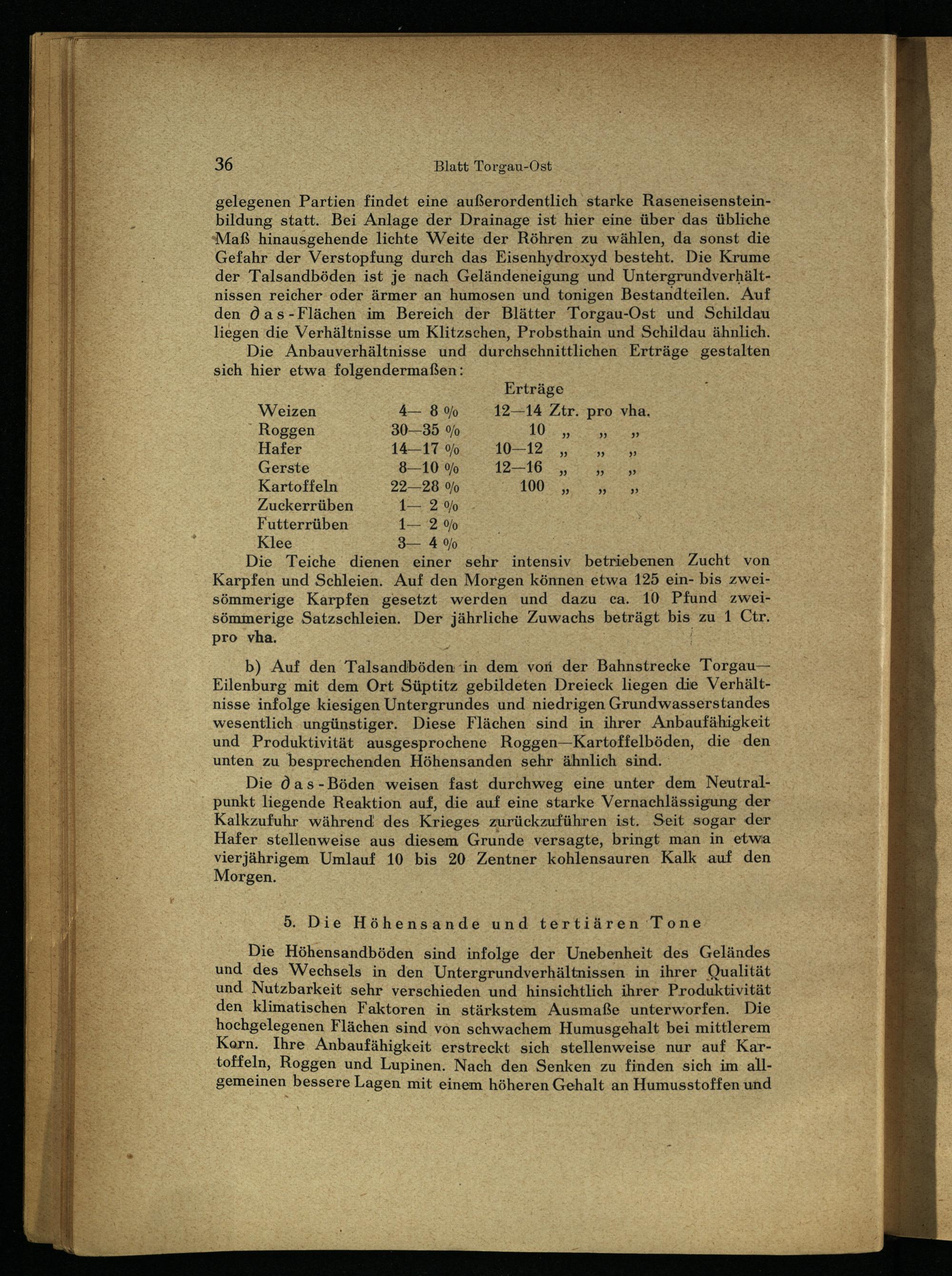 gelegenen Partien findet eine außerordentlich starke Raseneisensteinbildung statt. Bei Anlage der Drainage ist hier eine über das übliche Maß hinausgehende lichte Weite der Röhren zu wählen, da sonst die Gefahr der Verstopfung durch das Eisenhydroxyd besteht. Die Krume der Talsandböden ist je nach Geländeneigung und Untergrundverhältnissen reicher oder ärmer an humosen und tonigen Bestandteilen. Auf den 0 as-Flächen im Bereich der Blätter Torgau -Ost und Schildau liegen die Verhältnisse um Klitzschen, Probsthain und Schildau ähnlich.
