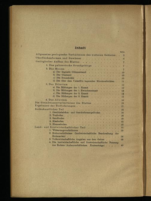 1. Das paläozoische Grundeebira ge 2. Das Miocän A a) Der liegende(Himmersand b) Der Glassand c) Die Braunkohle X A d) Die über dem Unterflöz jarer nden Miocänschichten. 3. Das Diluvium S a) Die Bildungen der 1. Kiszeit 7 b) Die Bildungen der 1. Zwischeneiszeit c)_ Die Bildungen der 2, Eiszeit d) Die Bildungen der 3. Eiszeit 4. Das Alluvium A Die Grundwasserverhältnisse des Blattes Ergebnisse der Tiefbohrungen. WE A Bodenkundlicher Teil: 1. Geschiebelehm- und Geschiebemer gelboden. 2. Tonboden. ' 3. Sandboden ‘4. Kiesboden 5. Humusboden Land- und forstwirtschaftli eher"Teil 1. Witterungsverhältnisse. 2. Bodenverhältnisse(andwirtschaftliche Beschreibung der Bodenarten).. . Volkswirtschaftliche‘Anıab en aus‘dem Gebiet R . Die landwirtschaftliche und forstwirtschaftliche Nutzung des Bodens(Anbauverhältnisse. Ernteerträge)..,