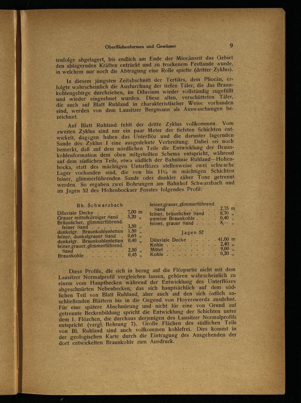 Diese Profile, die sich in bezug auf die Flözpartie nicht mit dem Lausitzer Normalprofil vergleichen lassen, gehören wahrscheinlich zu einem vom Hauptbecken während der Entwicklung des Unterflözes abgeschnürten Nebenbecken, das sich hauptsächlich auf dem südlichen Teil von Blatt Ruhland, aber auch auf den sich östlich anschließenden Blättern bis in die Gegend von Hoyerswerda ausdehnt. Für eine spätere Abschnürung und nicht für eine von Grund auf getrennte Beckenbildung spricht die Entwicklung der Schichten unter dem 1. Flözchen, die durchaus derjenigen des Lausitzer Normalprofils entspricht( vergl. Bohrung 7). Große Flächen des südlichen Teils von Bl. Ruhland sind auch vollkommen kohlefrei. Dies kommt in der geologischen Karte durch die Eintragung des Ausgehenden der dort entwickelten Braunkohle zum Ausdruck.