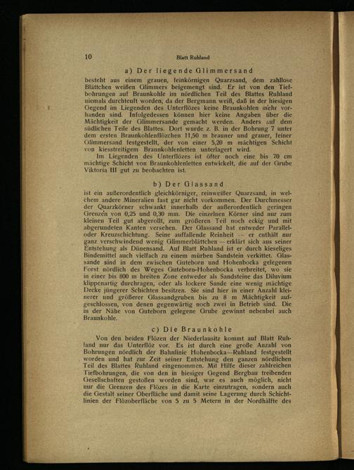 ist ein außerordentlich gleichkörniger, reinweißer Quarzsand, in welchem ‚andere Mineralien fast gar nicht vorkommen. Der Durchmesser der Quarzkörner schwankt innerhalb der außerordentlich geringen Grenzen von 0,25 und 0,30 mm. Die einzelnen Körner sind nur zum kleinen Teil gut abgerollt, zum größeren Teil noch eckig und mit abgerundeten Kanten versehen. Der Glassand hat. entweder Paralleloder Kreuzschichtung. Seine auffallende Reinheit-- er enthält nur ganz verschwindend wenig Glimmerblättchen— erklärt sich aus seiner Entstehung als Dünensand. Auf Blatt Ruhland ist er durch kieseliges Bindemittel auch vielfach zu einem mürben Sandstein verkittet. Glassande sind in dem zwischen Guteborn und Hohenbocka gelegenen Forst nördlich des Weges Guteborn-Hohenbocka verbreitet, wo sie in einer bis 800 m breiten Zone entweder als Sandsteine das Diluvium klippenartig durchragen, oder als lockere Sande eine wenig ınächtige Decke jüngerer Schichten besitzen. Sie sind hier in einer Anzahl kleinerer und größerer Glassandgruben. bis zu‘ 8 m Mächtigkeit aufgeschlossen, von denen gegenwärtig noch zwei in Betrieb sind. Die in der Nähe von Guteborn gelegene Grube gewinnt nebenbei auch Braunkohle.