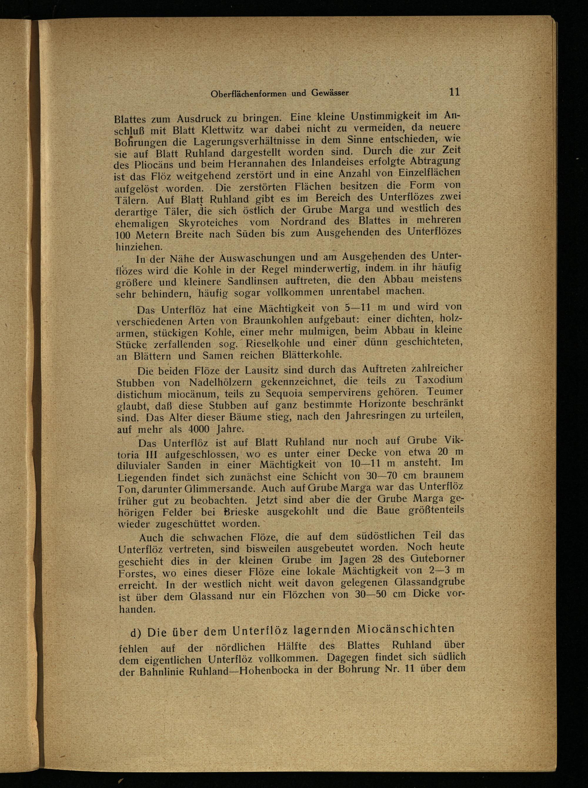 Das Unterflöz ist auf Blatt Ruhland nur noch auf Grube Viktoria III aufgeschlossen, wo es unter einer Decke von etwa 20 m diluvialer Sanden in einer Mächtigkeit' von 10—11 m ansteht. Im Liegenden findet sich zunächst eine Schicht von 30—70 cm braunem Ton, darunter Glimmersande. Auch auf Grube Marga war das Unterflöz früher gut zu beobachten. Jetzt sind aber die der Grube Marga: gehörigen Felder bei Brieske ausgekohlt und die Baue größtenteils wieder zugeschüttet. worden.: