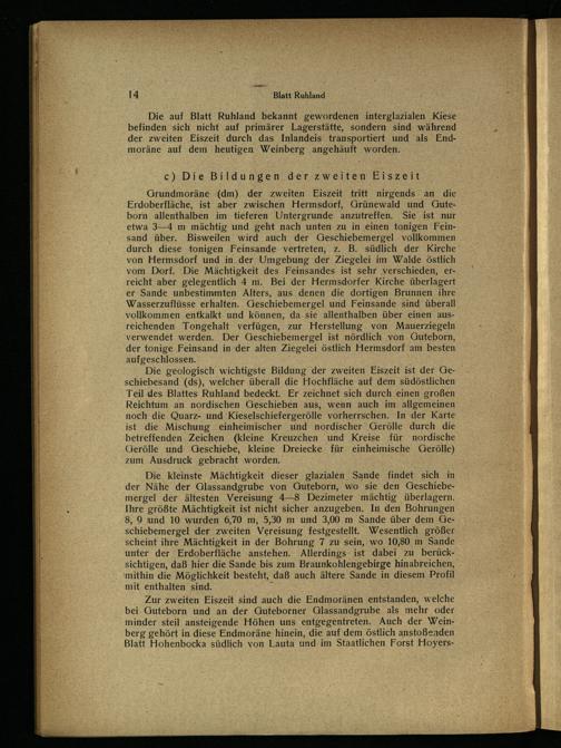 Grundmoräne(dm) der zweiten Eiszeit tritt nirgends an die Erdoberfläche, ist aber zwischen Hermsdorf, Grünewald und Guteborn allenthalben im tieferen Untergrunde anzutreffen. Sie ist nur etwa 3—4 m mächtig und geht nach unten zu in einen tonigen Feinsand über. Bisweilen wird auch der Geschiebemergel vollkommen durch diese tonigen Feinsande vertreten, z. B. südlich der Kirche von Hermsdorf und in.der Umgebung der Ziegelei im Walde östlich vom Dorf. Die Mächtigkeit des Feinsandes ist sehr verschieden, erreicht aber gelegentlich 4 m. Bei der Hermsdorfer Kirche überlagert er Sande unbestimmten Alters, aus denen die dortigen Brunnen ihre Wasserzuflüsse erhalten. Geschiebemergel und Feinsande sind überall vollkommen entkalkt und können, da.sie allenthalben über einen ausreichenden Tongehalt verfügen, zur Herstellung von Mauerziegeln verwendet werden. Der Geschiebemergel ist nördlich. von. Guteborn, der tonige Feinsand in der alten Ziegelei östlich Hermsdorf am besten aufgeschlossen.; N