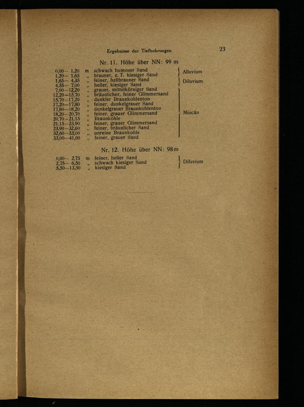 bräunlicher, feiner Glimmersand dunkler Braunkohlenton feiner, dunkelgrauer Sand dunkelgrauer Braunkohlenton feiner, grauer Glimmersand Braunkohle S feiner, grauer Glimmersand feiner, bräunlicher Sand