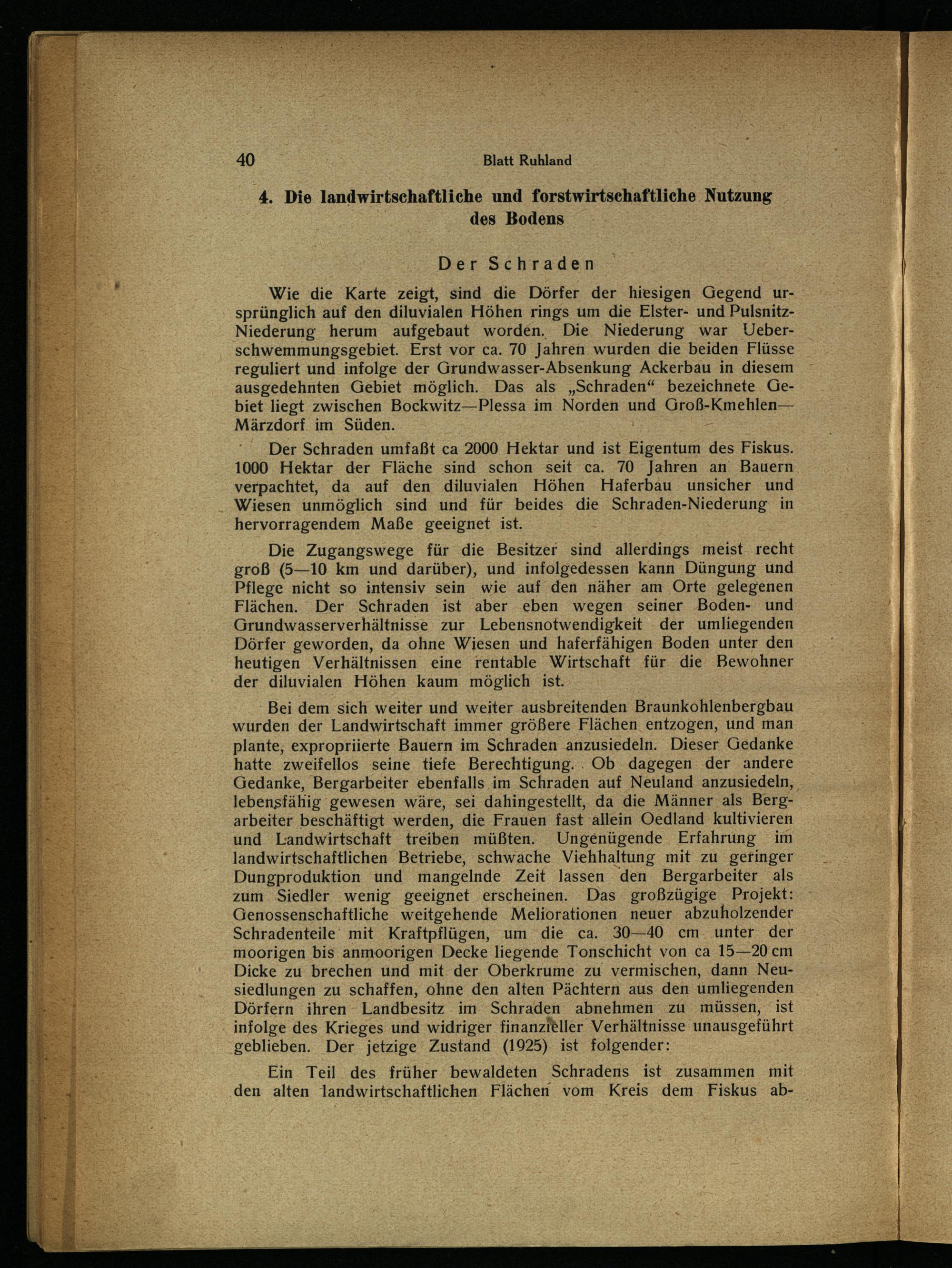 Bei dem sich weiter und weiter ausbreitenden Braunkohlenbergbau wurden der Landwirtschaft immer größere Flächen entzogen, und man plante, expropriierte Bauern im Schraden anzusiedeln. Dieser Gedanke hatte zweifellos seine tiefe Berechtigung... Ob dagegen der andere Gedanke, Bergarbeiter ebenfalls im Schraden auf Neuland anzusiedeln, lebensfähig gewesen wäre, sei dahingestellt, da die Männer als Berg- 1 arbeiter beschäftigt werden, die Frauen fast allein Oedland kultivieren hund Landwirtschaft treiben müßten. Ungenügende Erfahrung im; A landwirtschaftlichen. Betriebe, schwache Viehhaltung mit zu geringer Dungproduktion und mangelnde Zeit lassen den Bergarbeiter als zum. Siedler wenig geeignet erscheinen. Das großzügige Projekt:. Genossenschaftliche weitgehende Meliorationen neuer abzuholzender Schradenteile' mit Kraftpflügen, um die ca. 30—40 cm. unter der moorigen bis anmoorigen Decke liegende Tonschicht von ca 15—20 cm Dicke zu brechen und mit der Oberkrume zu vermischen, dann Neusiedlungen zu schaffen, ohne den alten Pächtern aus den umliegenden Dörfern ihren- Landbesitz im Schraden abnehmen zu müssen, ist infolge des Krieges und widriger finanzieller Verhältnisse unausgeführt geblieben. Der jetzige’ Zustand(1925) ist folgender: