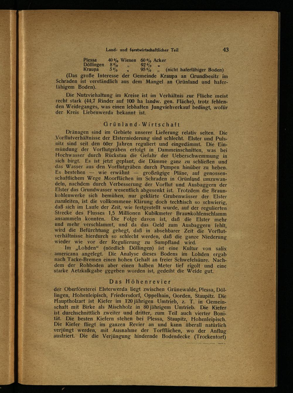 Plessa 40% Wiesen 60%, Acker Döllingen. 8% e 02060= Kraupa 59%® 95%„(nicht haferfähiger Boden) (Das große Interesse der Gemeinde Kraupa an Grundbesitz im Schraden ist verständlich aus dem Mangel an Grünland und. haferfähigem Boden).;;