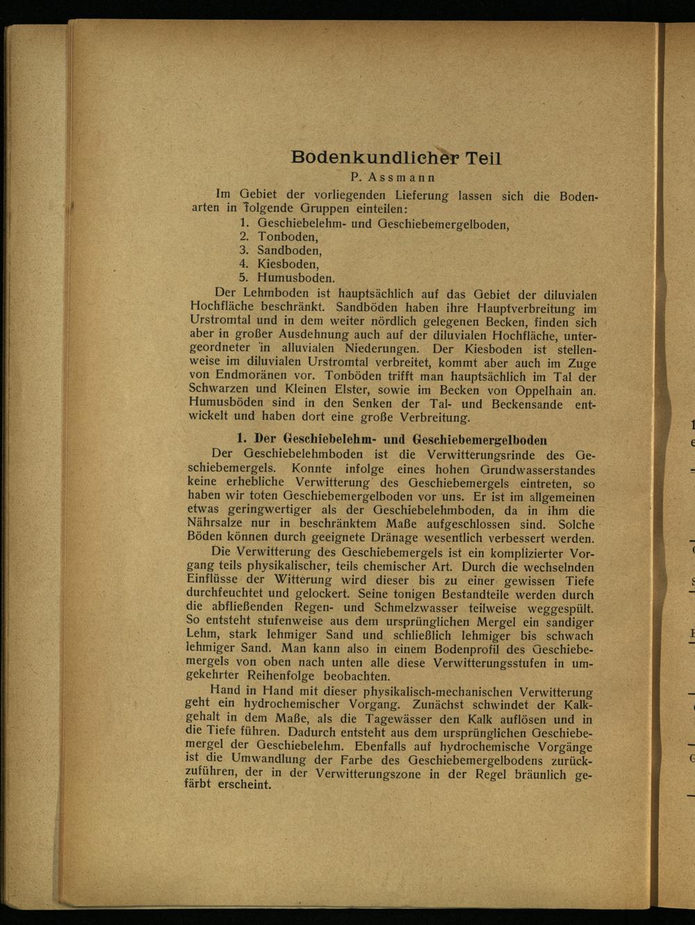Der Lehmboden ist hauptsächlich auf das Gebiet der diluvialen Hochfläche beschränkt. Sandböden haben ihre Hauptverbreitung im Urstromtal und in dem weiter nördlich gelegenen Becken, finden sich aber in großer Ausdehnung auch‘ auf der diluvialen Hochfläche, untergeordneter in alluvialen Niederungen. Der Kiesboden ist stellenweise im diluvialen Urstromtal verbreitet, kommt aber auch im Zuge von Endmoränen vor. Tonböden trifft man hauptsächlich im Tal der Schwarzen und Kleinen Elster, sowie im Becken von Oppelhain an. Humusböden‘sind in den Senken der Tal- und Beckensande entwickelt und haben dort eine große Verbreitung.