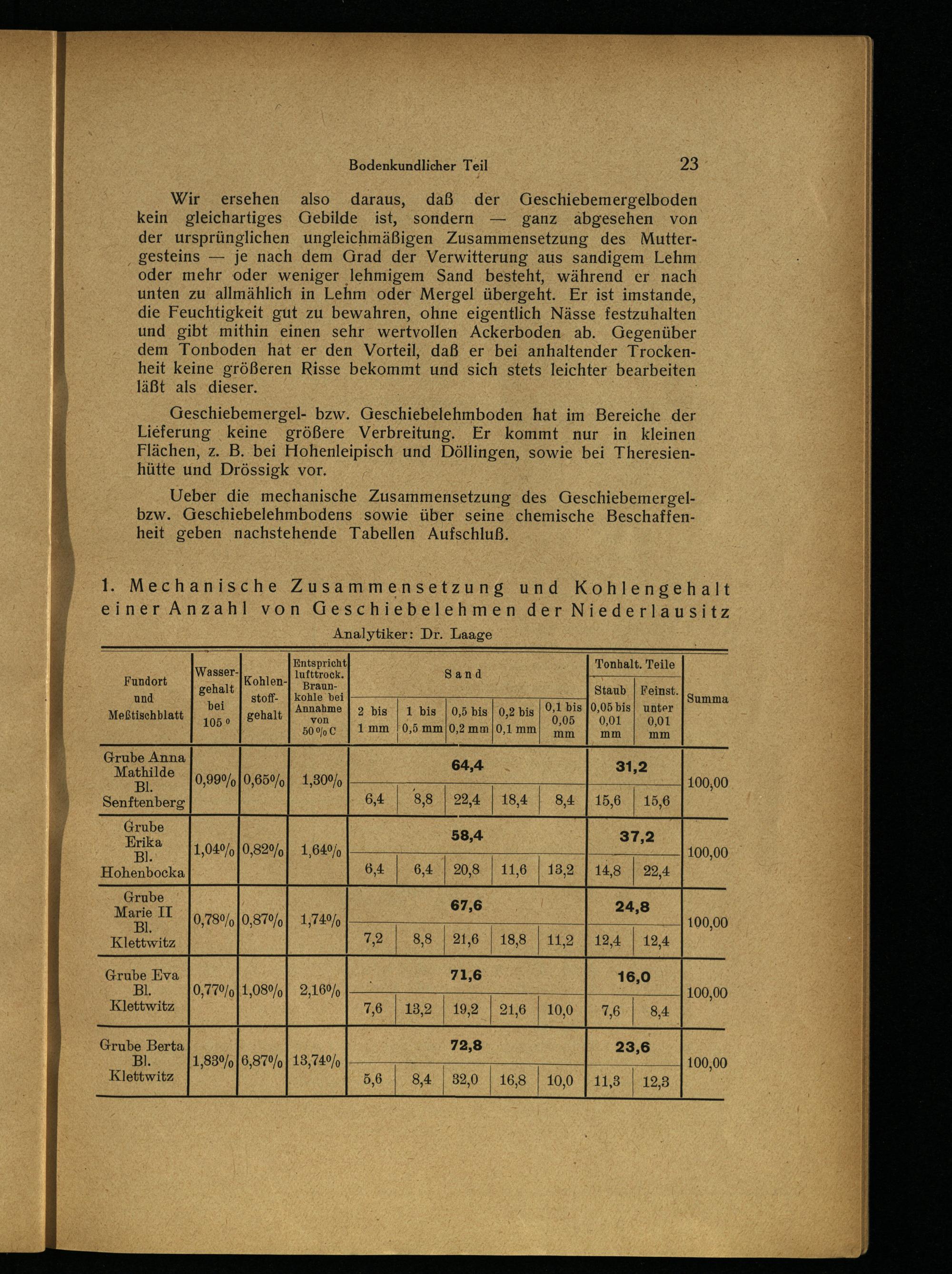 1. Mechanische Zusammensetzung und Kohlengehalt einer Anzahl von Geschiebelehmen der Niederlausitz Analytiker: Dr. Laage