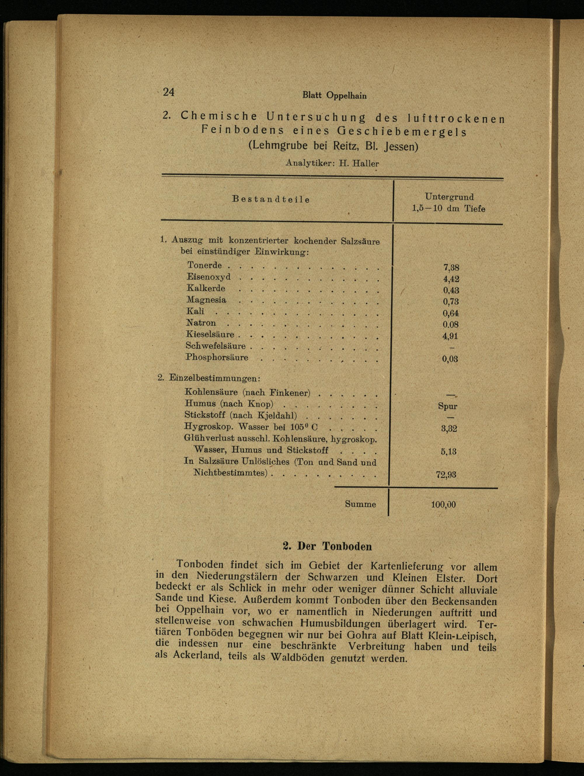 Z..Chemische Untersuchung des lufttrockenen Feinbodens eines Geschiebemergels (Lehmgrube bei Reitz, Bl. Jessen) Analytiker: H. Haller N