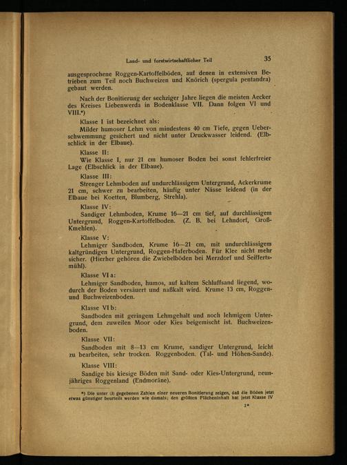 *) Die unter(3) gegebenen Zahlen einer neueren Bonitierung zeigen, daß die Böden. jetzt etwas günstiger beurteilt werden wie damals; den größten Flächeninhalt hat jetzt Klasse IV
